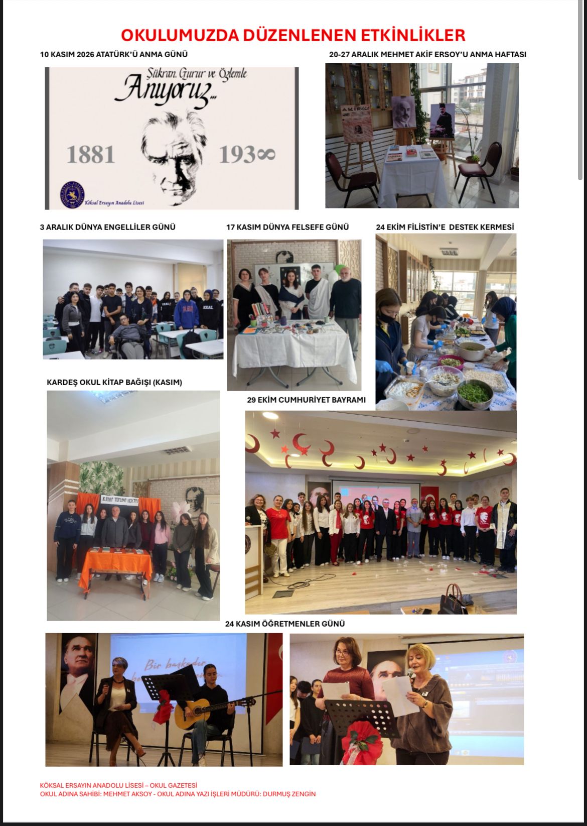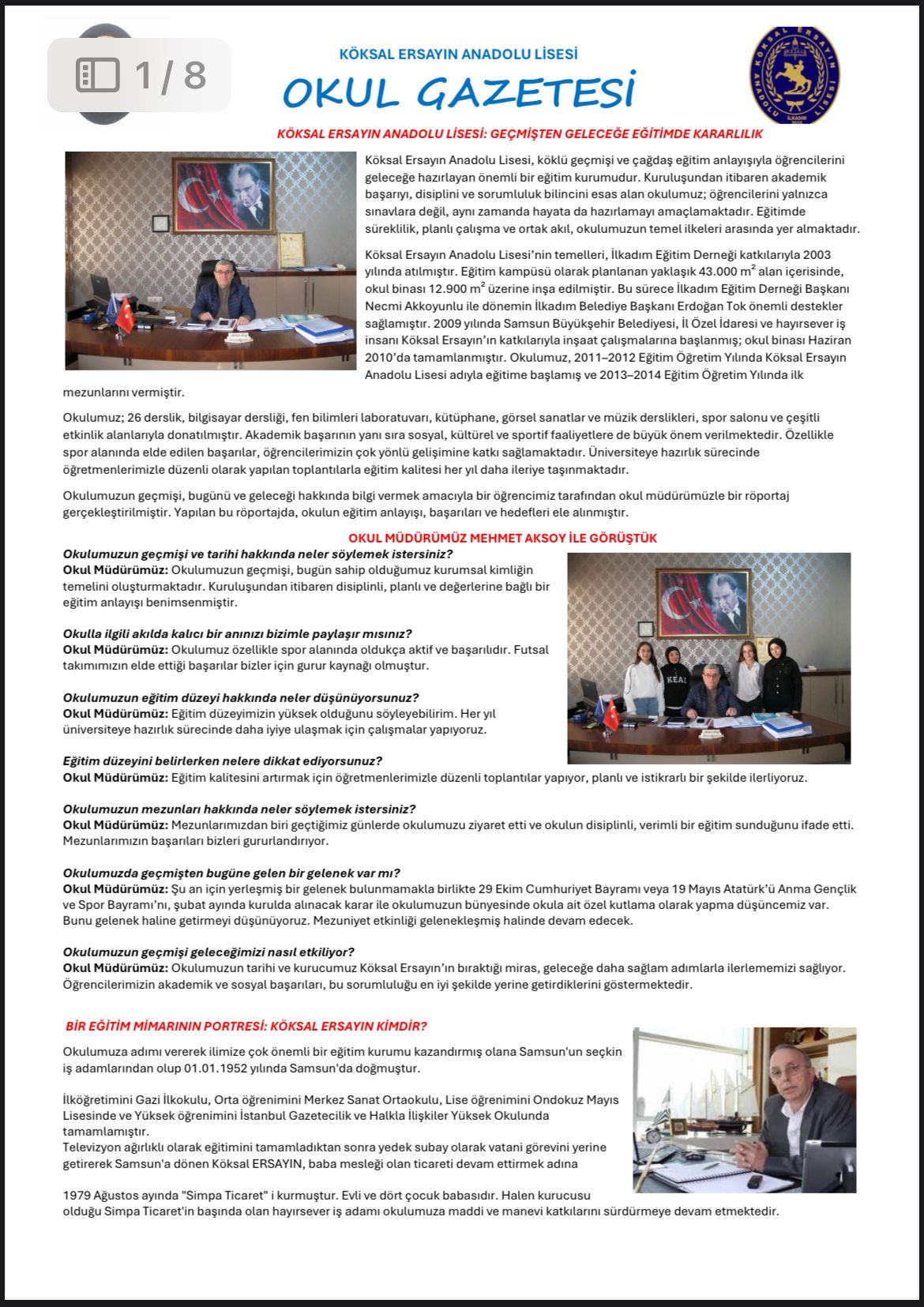 Köksal Ersayın Anadolu Lisesi öğrencileri tarafından Genç AR-GE faaliyetleri kapsamında Ocak 2026’da okul gazetesi çıkarma çalışması gerçekleştirilmiştir. Bu faaliyet, öğrencilerin araştırma yapma, eleştirel düşünme, yazılı ve görsel iletişim becerilerini geliştirmeyi; aynı zamanda okul kültürünü ve aidiyet duygusunu güçlendirmeyi amaçlamıştır. Çalışma sürecinde gönüllülük esasına dayalı olarak 12 öğrenci aktif görev alırken, 2 öğretmen rehberlik ve danışmanlık yapmıştır. Öğrenciler içerik planlamasından tasarıma, haber yazımından röportajlara kadar tüm aşamalarda sorumluluk üstlenmiş; böylece ekip çalışması, zaman yönetimi ve proje yürütme konularında önemli deneyimler kazanmıştır. Gazetede okul içi etkinlikler, başarı hikâyeleri, kültür-sanat içerikleri ile bilimsel ve teknolojik gelişmelere yönelik yazılar yer almıştır. İçerikler hazırlanırken etik yayıncılık ilkeleri gözetilmiş, kaynak kullanımı ve dil bilgisi konusunda özen gösterilmiştir. Faaliyet boyunca öğrenciler, öğretmen rehberliğinde araştırma yöntemleri, haber dili, röportaj teknikleri ve dijital yayıncılık hakkında bilgilendirilmiştir. Ortaya çıkan okul gazetesi, öğrencilerin yaratıcılıklarını ortaya koymalarına olanak sağlamış ve okul genelinde ilgiyle karşılanmıştır. Bu çalışma, Genç AR-GE faaliyetlerinin hedefleri doğrultusunda öğrencilerin akademik, sosyal ve iletişimsel gelişimlerine katkı sağlayan başarılı bir uygulama olmuştur.