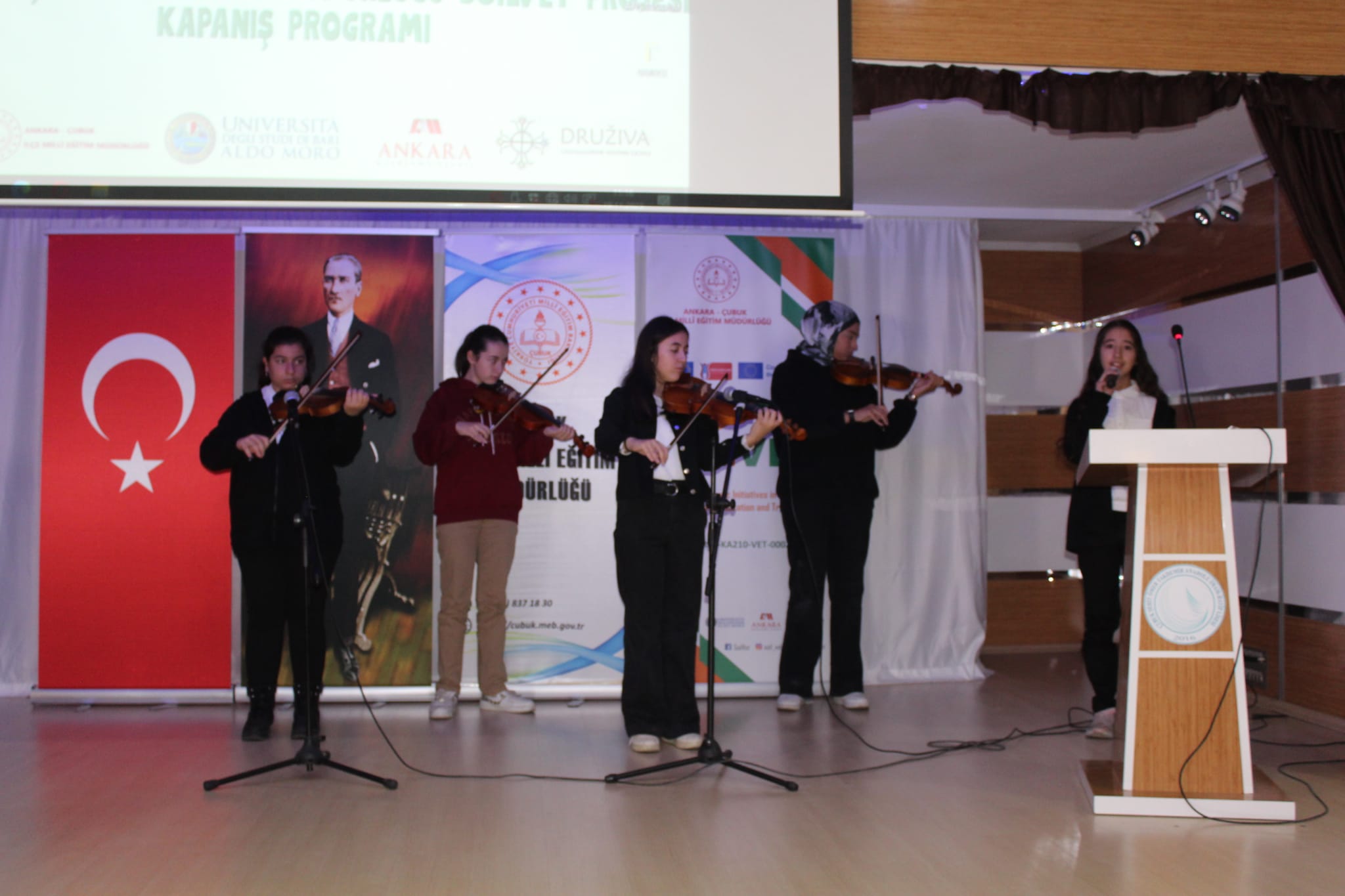 Çubuk İlçe Millî Eğitim Müdürlüğü koordinesinde yürütülen SoilVET Erasmus+ projesinin kapanış programı, projenin temel çıktıları arasında yer alan çevre ve küresel ısınma temalı afiş tasarım yarışması ödül töreni ile entegre bir şekilde gerçekleştirilmiştir. 19 Kasım 2025 tarihindeki bu etkinlik; Genç AR-GE projesinin uluslararası iş birliği, ekolojik farkındalık ve sanatsal yetenek keşfi vizyonuna doğrudan hizmet etmiştir. Ankara İl Millî Eğitim Müdür Yardımcıları ve İlçe Millî Eğitim Müdürü’nün teşrifleriyle icra edilen program, Çubuk BİLSEM öğrencilerinin sunduğu müzik dinletisiyle sanatsal bir derinlik kazanmıştır. Toplam 250 öğrencinin katılımıyla gerçekleşen faaliyet, öğrencilerin tasarım yeteneklerini küresel sorunlara çözüm odaklı kullanmalarını teşvik ederken, akademik motivasyon ve projenin görünürlüğü açısından somut kazanımlar sağlamıştır. Kapanış programı vesilesiyle kurumsal düzeyde uluslararası kapasite gelişimi desteklenmiş ve çevre bilincinin yaygınlaştırılması noktasında stratejik bir başarı elde edilmiştir. BİLSEM öğrencilerinin performansı ise sanatsal üretimin desteklenmesi ve yeteneklerin görünür kılınması hedefleriyle tam uyum göstermiştir. Bu etkinlik, projenin sürdürülebilirliği ve kurumsal temsil gücü adına nitelikli bir kapanış niteliği taşımaktadır.
