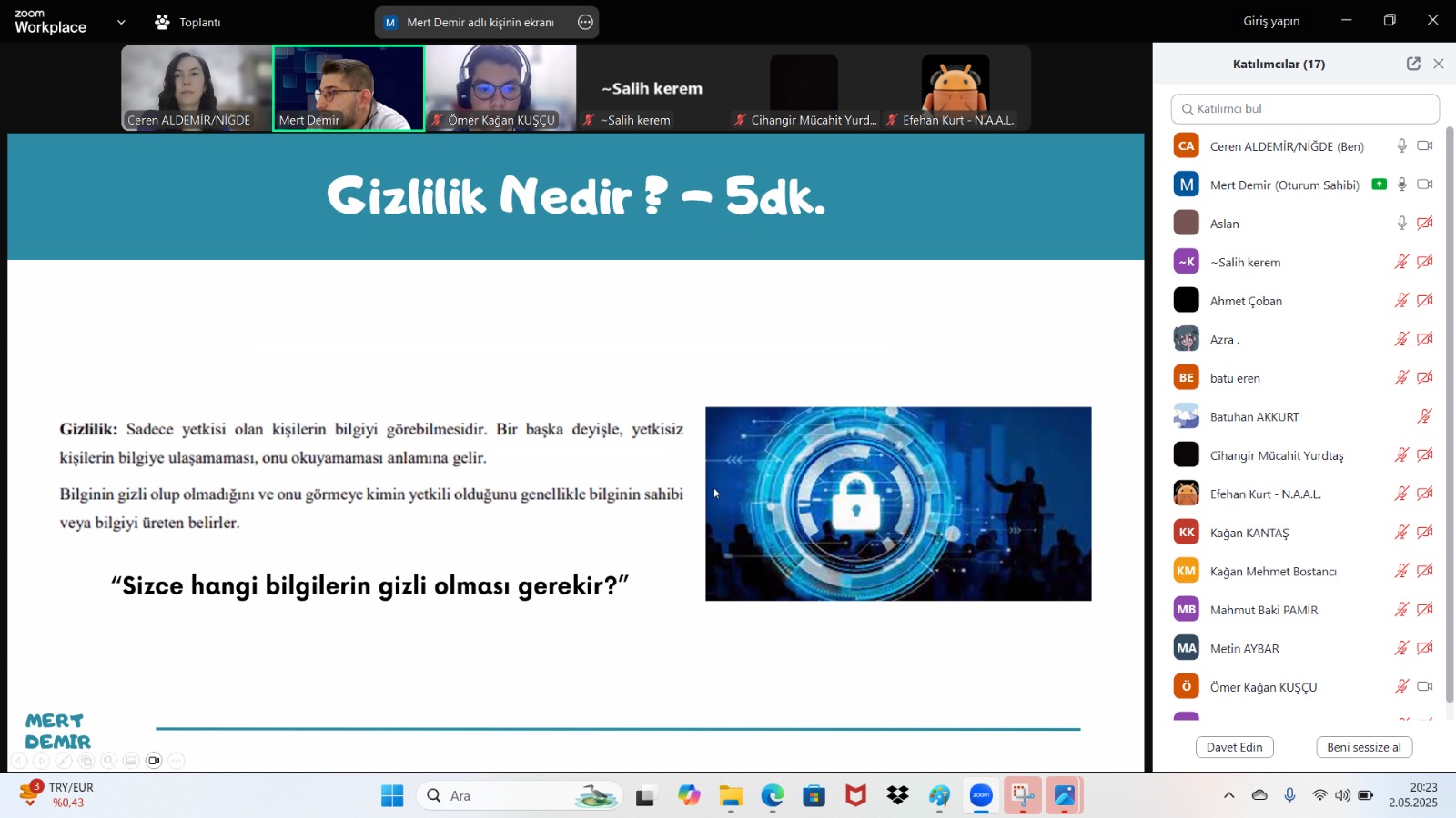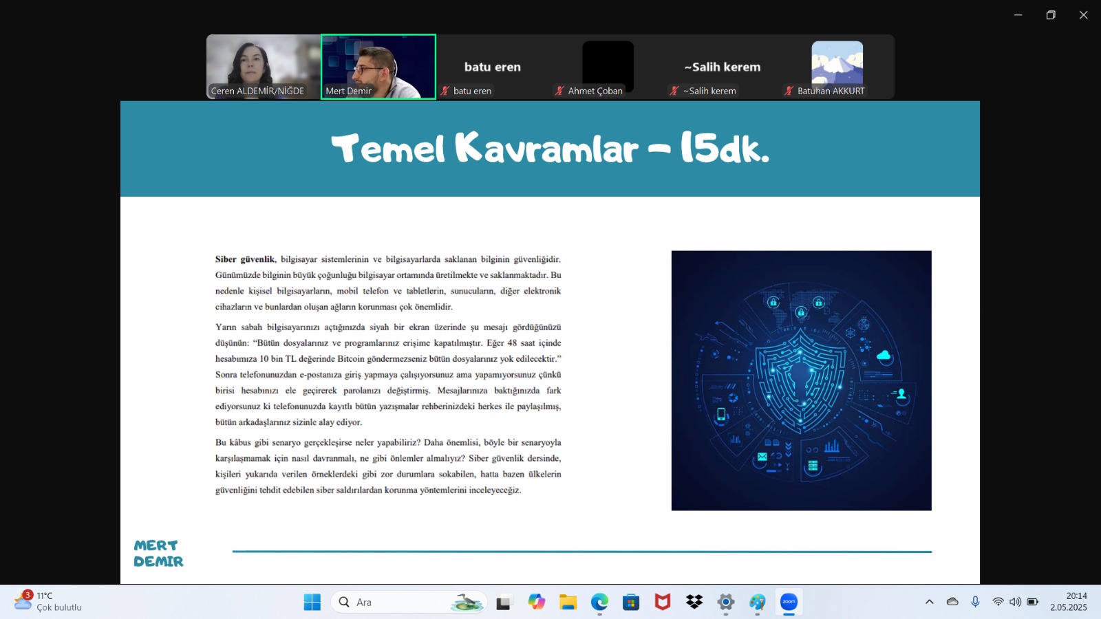Genç ARGE kapsamında düzenlenen Temel Siber Güvenlik Eğitimi ile 48 lise öğrenci dijital dünyada kendilerini koruma, bilinçli internet kullanımı ve siber tehditlere karşı farkındalık kazanma fırsatı yakaladı. Bilgisayar mühendisi Mert Demir tarafından verilen eğitimler, 02 Mayıs 2025 tarihinde Zoom üzerinden bir buçuk saat süresince gerçekleştirildi. Eğitimde öğrenciler, dijital dünyada güvenli bir şekilde hareket etmeyi, bilinçli internet kullanımı konusunda farkındalık kazanmayı ve siber tehditlere karşı nasıl önlem alacaklarını öğrendiler. Somut çıktılar arasında, temel siber güvenlik becerilerinin geliştirilmesi, bilinçli internet kullanımı konusunda farkındalık kazanılması ve siber tehditlere karşı korunma yöntemlerinin öğrenilmesi yer aldı. Hedef, öğrencilerin dijital dünyada güvenli bir şekilde hareket etmelerini sağlamak, bilinçli internet kullanımı ve siber güvenlik konusunda farkındalık oluşturmak ve siber tehditlere karşı öğrencilere gerekli bilgi ve becerileri kazandırmaktır. Eğitimde teorik bilgilerin yanı sıra pratik uygulamalar ve örnekler sunuldu, öğrencilerin soruları cevaplandı ve interaktif bir öğrenme ortamı sağlandı. Bu etkinlikte Niğde Ömer Halisdemir Üniversitesi önemli bir paydaş olarak yer aldı.
