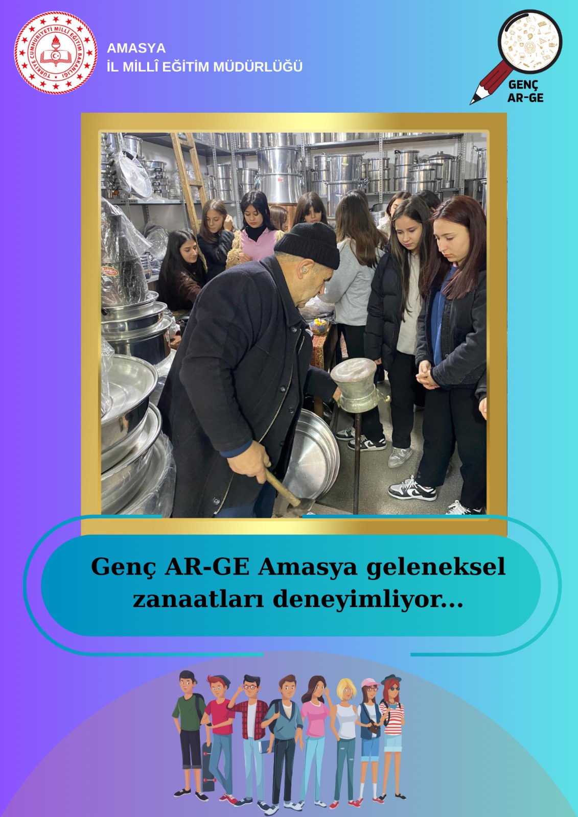 Amasya İl Milli Eğitim Müdürlüğü Genç Ar-Ge Temsilcileri, şehrin sahip olduğu zengin kültürel mirası gençlere tanıtmak, yöresel değerlerin korunmasına ve yaşatılmasına katkı sağlamak amacıyla kapsamlı bir kültürel etkinlik serisi başlattı. "Köklerimizden Geleceğe: Yöresel Değerlerimizle Buluşuyoruz" başlığıyla düzenlenen etkinlikler dizisi, gençlerin memleketlerine olan aidiyet duygularını güçlendirmeyi, yerel kültürel değerleri yakından tanımalarını sağlamayı ve bu değerleri gelecek kuşaklara aktarma bilincini geliştirmeyi hedefliyor. Amasya İl Milli Eğitim Müdürlüğü Ar-Ge Birimi öncülüğünde yürütülen projede, Genç Ar-Ge Temsilcileri, şehir merkezinde ve ilçelerde çeşitli etkinliklerle Amasya'nın tarihî, kültürel ve sanatsal zenginliklerini gençlerin gündemine taşımayı amaçlıyor. Program kapsamında öğrenciler, yerel sanatçı ve zanaatkârlarla bir araya geliyor; geleneksel el sanatları, müzik, halk oyunları, yöresel yemek kültürü, geleneksel giyim kuşam, sözlü kültür ve hikâye anlatıcılığı gibi birçok alanda uygulamalı atölye çalışmalarına katılıyor. Strateji Geliştirme AR-Ge Şube Müdürü Fahrettin Bülbül yaptığı açıklamada, günümüz gençlerinin teknolojiyle iç içe büyüdüğünü, ancak geçmişten gelen kültürel değerlerin öneminin her geçen gün daha fazla fark edilmesi gerektiğini vurguladı. Özdemir, "Bizler geleceğe bakarken köklerimizi unutmamalıyız. Özellikle Amasya gibi tarihi ve kültürel mirası zengin bir şehirde yaşayan biz gençler, bu değerleri tanımalı, yaşatmalı ve yaygınlaştırmalıyız. Ar-Ge yalnızca bilimsel araştırmalarla sınırlı değildir. Kültürel değerleri araştırmak, onları gün yüzüne çıkarmak, yaşatmak ve yeni nesillere taşımak da Ar-Ge'nin önemli bir parçasıdır" ifadelerini kullandı. Etkinlikler kapsamında 2 öğretmen rehberliğinde 14 öğrenci tarafından ilk olarak Amasya'nın ünlü yöresel sanatlarından biri olan bakırcılık sanatıyla ilgili atölye çalışması gerçekleştirildi. Amasya'nın tarihi Bakırcılar Çarşısı'nda düzenlenen atölye çalışmasında öğrenciler, bakırcılık ustalarıyla birlikte bakır işlemeciliğinin inceliklerini öğrenme fırsatı buldu. Usta zanaatkârların rehberliğinde kendi bakır tabaklarını işleyen gençler, el emeği göz nuru ürünlerin nasıl sabırla ve ustalıkla yapıldığını deneyimledi. Ardından Amasya'ya özgü geleneksel halk oyunları ve müzikleri tanıtıldı. Amasya Halk Oyunları Derneği'nin katkılarıyla düzenlenen etkinlikte öğrenciler, Amasya zeybeği, halayları ve yerel türküler eşliğinde coşkulu anlar yaşadı. Gençlerin yöresel kıyafetlerle sahneye çıkarak halk oyunlarını sergilemeleri, etkinliğe katılan vatandaşlar tarafından büyük beğeniyle izlendi.