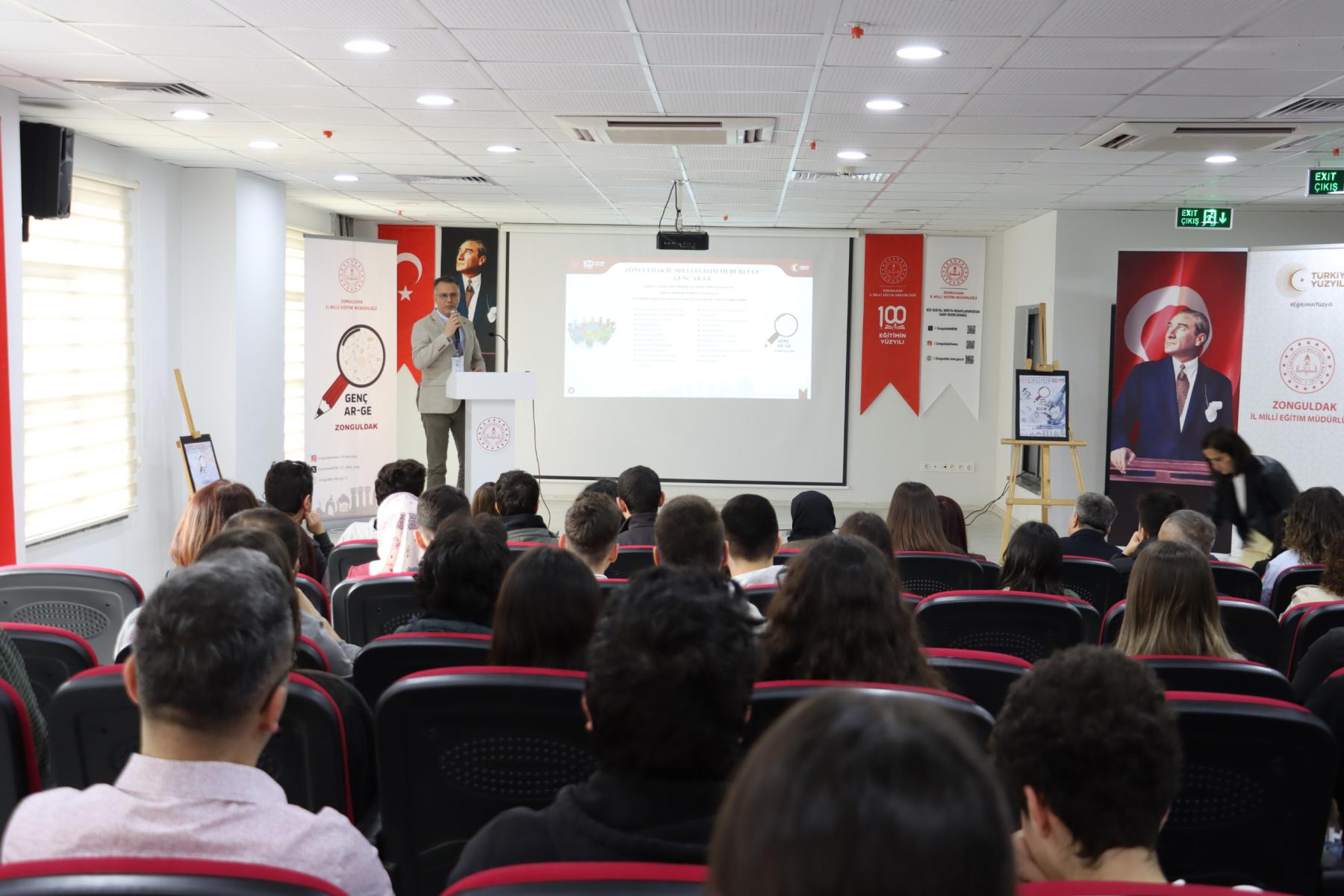 Amacımız, gençlerimizin fiziksel, sosyal ve düşünsel açıdan çok yönlü gelişimlerini desteklemek; erken yaşlardan itibaren yenilikçilik ve girişimcilik becerilerini teşvik edecek bilimsel, sanatsal, kültürel ve sportif faaliyetlere aktif katılımlarını özendirmektir. Bu doğrultuda, gençlerimizi sadece bilgi tüketen bireyler değil, aynı zamanda bilgi üreten, yöneten ve paylaşan bireyler olarak yetiştirmeyi, toplumda daha etkin bir rol oynamalarını sağlamayı, onları daha bilinçli bireyler olarak yetiştirmeyi hedeflemekteyiz. Bu kapsamda, 14.03.2025 tarihinde Zonguldak İl Millî Eğitim Müdürlüğü Konferans Salonunda düzenlenen etkinliğimiz, İl Müdürümüz Osman Bozkan'ın açılış konuşmasıyla başlayıp ardından Ar-Ge Birimi öğretmenimiz tarafından öğrenci ve öğretmenlerimize yönelik bilgilendirme sunumu gerçekleştirilmiştir. Etkinliğe 38 öğrenci ve 12 öğretmen katılım sağlamış olup, katılımcıların bilimsel, sanatsal, kültürel ve sportif faaliyetlere olan ilgisi artırılmış, gençlerin fiziksel, sosyal ve düşünsel gelişimlerine katkı sağlanmıştır. Ayrıca, etkinlik sonunda katılımcılar arasında bilgi paylaşımı ve etkileşim artmış, öğrencilerin yaratıcı düşünme yetenekleri pekiştirilmiştir.