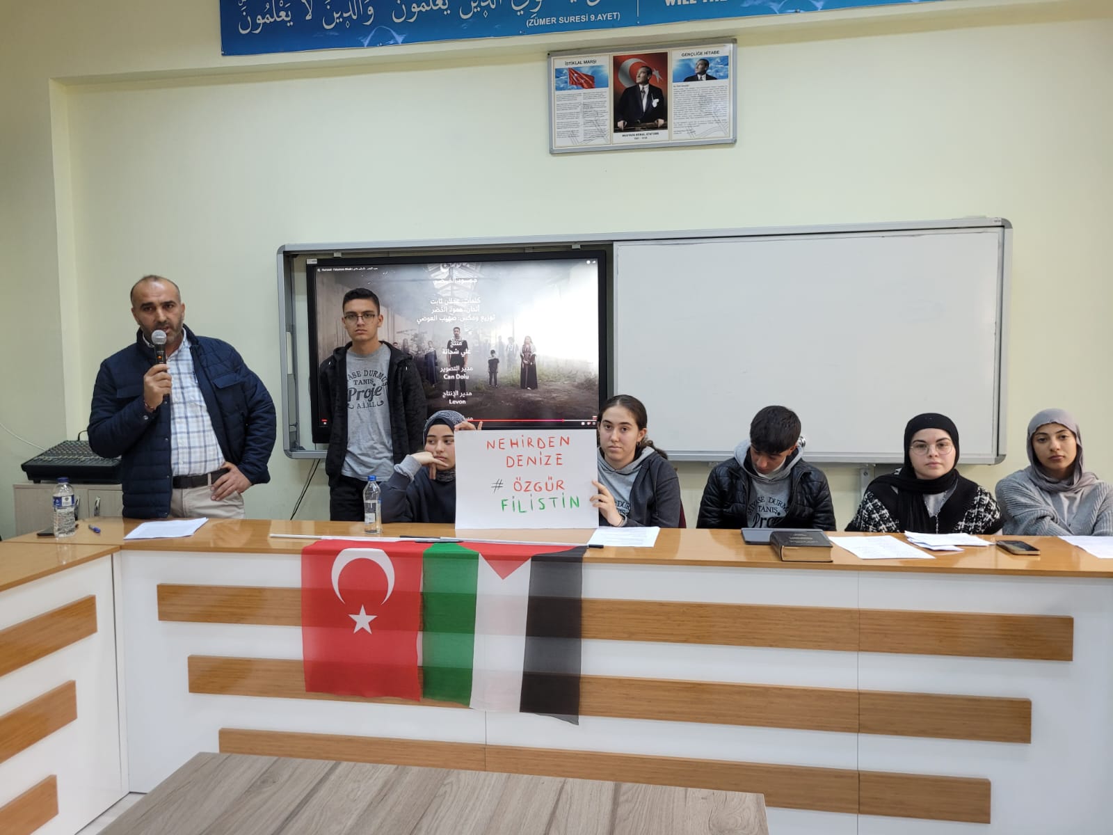 Miyase Durmuş Tanış Anadolu İmam Hatip Lisesinde Genç Ar-Ge çalışmaları kapsamında öğrencilere yönelik “Özgür Filistin” temalı farkındalık etkinliği gerçekleştirildi. Etkinlikte Filistin’de yaşanan insani durum, adalet, özgürlük ve insan hakları bağlamında ele alındı. Program kapsamında öğrenciler tarafından hazırlanan sunumlar, pankart çalışmaları, şiir ve duygu paylaşımları ile Filistin halkının yaşadığı zorluklara dikkat çekildi. Etkinlik aracılığıyla öğrencilerin duyarlılık, empati, sorumluluk bilinci ve toplumsal farkındalık duygularının geliştirilmesi amaçlandı. Etkinliğin sunum kısmında 6 öğrenci yer alırken 55 öğrenci de dinleyici olarak hazır bulundu. Genç Ar-Ge faaliyetlerinin öğrencilerin sadece akademik gelişimlerine değil, aynı zamanda değerler eğitimi ve sosyal bilinç kazanımlarına da katkı sunduğu vurgulanırken, bu tür etkinliklerin devam edeceği ifade edildi. Etkinlik, yapılan değerlendirme ve paylaşımların ardından sona erdi.