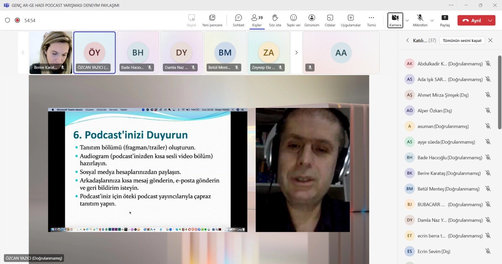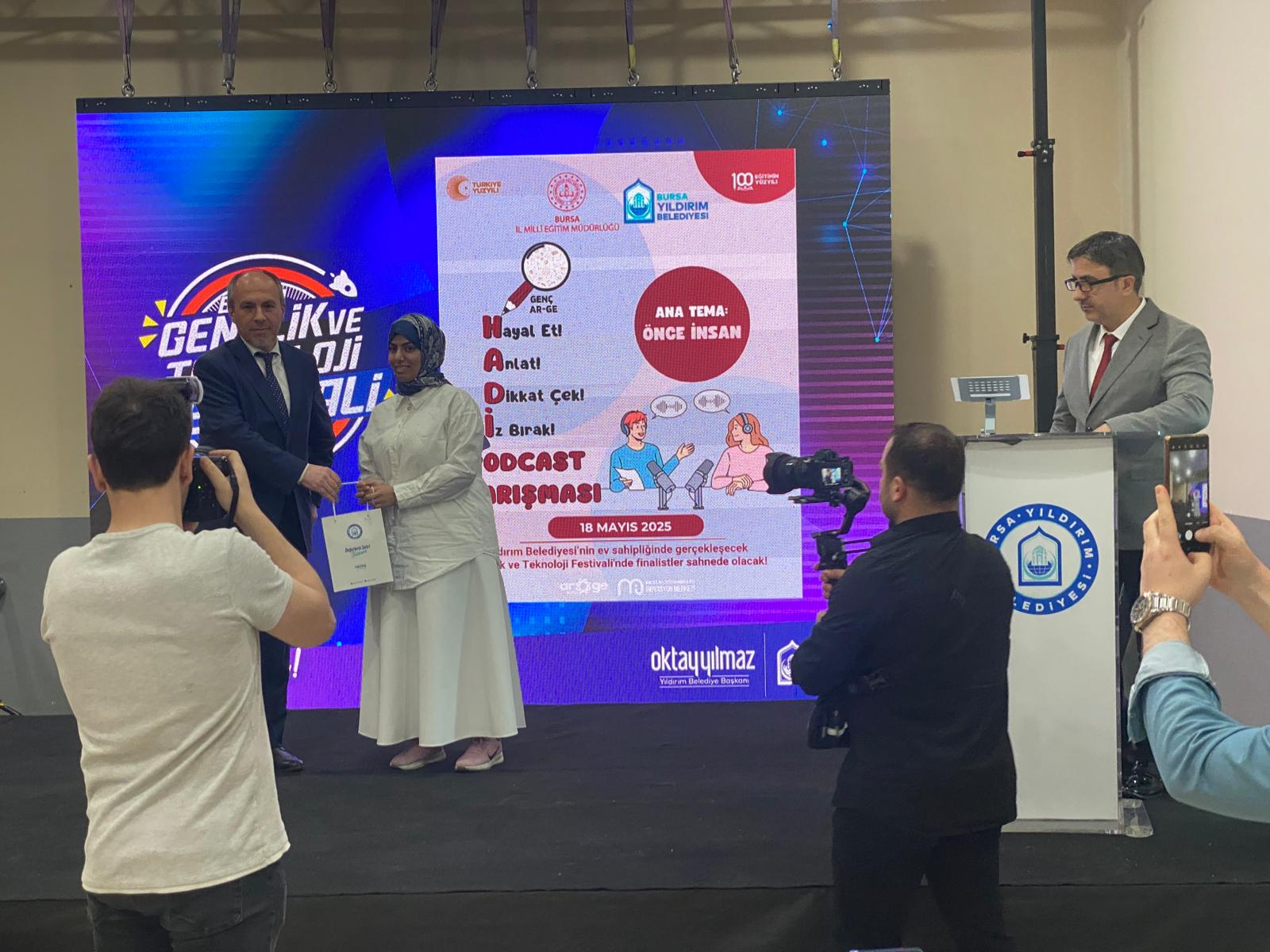 Bursa Genç Ar-Ge faaliyetleri kapsamında İnovasyon Merkezi tarafından lise öğrencilerinin insani değerleri ve yetkinlikleri keşfederek, toplumsal farkındalıklarını artırmalarını, yaratıcılıklarını ve etkili iletişim becerilerini geliştirmeleri amacıyla “H.A.D.İ. (Hayal Et! Anlat! Dikkat Çek! İz Bırak!)” podcast yarışma etkinliği hazırlandı. Bu etkinlik lise öğrencilerinin dijital ve bilgi okuryazarlığı, eleştirel ve yaratıcı düşünme, iletişim ve iş birliği becerilerini geliştirmeye katkı sundu. Öğrenciler, podcast tasarım sürecini öğrenirken içerik oluşturma, prodüksiyon ve yeni medya stratejileri gibi konularda deneyim kazandı. Meraklarını ve yeteneklerini keşfederek kendilerini ifade etmeyi öğrenip, topluluk önünde konuşma becerilerini geliştirdi ve yenilikçi podcast yayınları üretti. • 04 – 21 Şubat 2025 tarihlerinde duyurusu yapılan etkinliğe bireysel ve en fazla 3 kişilik takım halinde 114 lise öğrencisi başvuru yaptı. • 24 Şubat – 21 Mart tarihleri arasında başvuru yapan öğrenciler için podcast içerik üretme eğitimleri ve deneyim paylaşım etkinlikleri gerçekleştirildi. • Nisan 2025 sonuna kadar öğrencilerden “Önce İnsan” temasında ürettikleri 3 podcast serisi içerikleriyle başvurularını tamamlamaları istendi. • Başvuru sürecinde 57 öğrencimiz tarafından toplam 72 podcast içeriği dijital ortamda gönderildi. Jüri üyeleri, özgünlükten ses kalitesine, içerik derinliğinden dinleyici etkileşimine kadar birçok kriteri dikkate alarak değerlendirmelerini yaptı. Değerlendirme sonucu ilk 11 de yer alan takımlar duyuruldu. • 18 Mayıs 2025 tarihinde Yıldırım Belediyesi’nin ev sahipliğinde düzenlenen “Gençlik ve Teknoloji Festivali” kapsamında gerçekleşen final programında katılımcılara katılım belgeleri ve hediyeleri takdim edildi. Yarışmanın ilk 3 ismine ise profesyonel podcast ekipmanları armağan edildi.