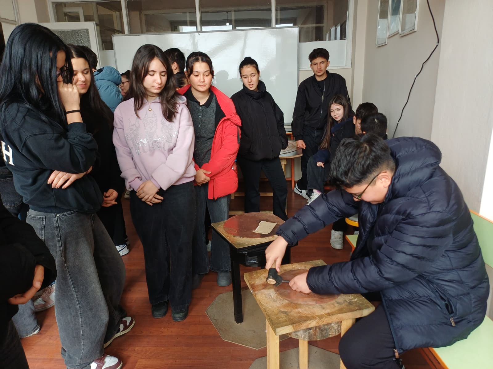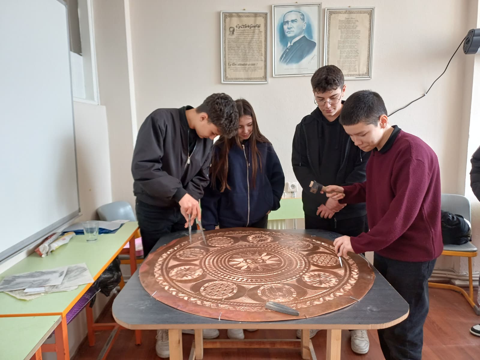 Millî Eğitim Bakanlığının Türkiye Yüzyılı vizyonu doğrultusunda yürütülen Genç AR-GE Projesi kapsamında, “Yerel El Sanatlarının Yaşatılması” teması çerçevesinde Bakır İşlemeciliği Atölyesi düzenlenmiştir. Kavaklıdere Belediyesinin iş birliğiyle gerçekleştirilen faaliyet, ilçedeki bakır işlemeciliği atölyesinde uygulanmıştır. Programa Sadık Göçen Anadolu Lisesi ile Halil İbrahim Boz Anadolu İmam Hatip Lisesinden toplam 25 öğrenci katılım sağlamış; İlçe Millî Eğitim Müdürlüğü yöneticileri ve alanında uzman bakır ustaları sürece rehberlik etmiştir. Etkinliğin temel amacı, yerel kültürel mirasın önemli bir unsuru olan bakır işlemeciliği sanatını genç nesillere tanıtmak, yaşatmak ve gelecek kuşaklara aktarılmasına katkı sunmaktır. Bu doğrultuda öğrencilerin geleneksel üretim süreçlerini yerinde gözlemlemeleri ve uygulamalı deneyim kazanmaları hedeflenmiştir. Atölye sürecinde bakır işlemeciliğinin tarihçesi, kullanılan araç-gereçler ve temel teknikler hakkında bilgilendirme yapılmış; öğrenciler ustaların rehberliğinde bakır yüzeylere geleneksel motifler işleyerek üretim sürecine aktif katılım sağlamıştır. Gerçekleştirilen çalışma, öğrencilerin kültürel mirasa yönelik farkındalıklarını artırmış; el becerileri, dikkat ve odaklanma düzeylerinin gelişmesine katkı sunmuştur. Üretim sürecine doğrudan katılım, özgüven kazanımını desteklemiş; sabır, disiplin ve sorumluluk bilincinin pekişmesine imkân tanımıştır. Ayrıca geleneksel meslekler hakkında mesleki farkındalık oluşması sağlanmıştır. Genç AR-GE Projesi’nin değer temelli ve üretim odaklı yaklaşımı doğrultusunda gerçekleştirilen bu atölye, yerel kültürel değerlerin korunması ve sürdürülebilirliğinin sağlanması açısından önemli bir adım olmuştur. Benzer uygulamaların farklı el sanatları alanlarında sürdürülmesi, gençlerin kültürel ve sanatsal gelişimine güçlü katkılar sunacaktır.