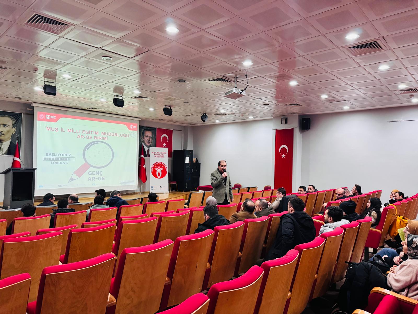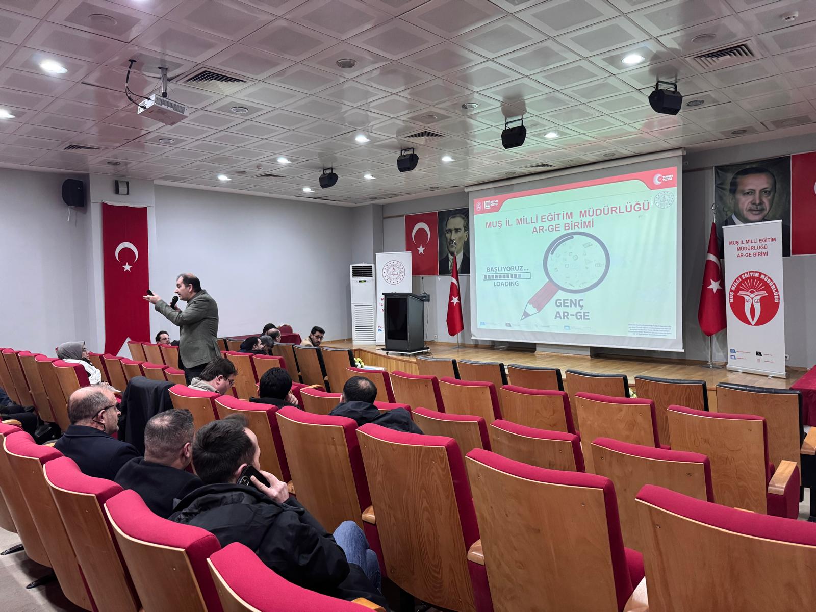 Toplantıda okul müdür yardımcıları ve öğretmenlerimize yönelik Genç Ar-Ge faaliyetlerimizi görüştük.Yapılan faliyetlerle ilgili okul yönetcilerimizin ve öğretmenlerimizin fikirlerine başvurduk.Okul yöneticisi ve öğretmenlerimizden oluşan 40 kişinin katılımıyla gerçekleşti.Muş Öğretmenevi konferans salonunda gerçekleşen programda faaliyetlerimizin ilimizdeki bütün okullarda duyurulması ve öğrencilerimizin etkin katılımı için yapılması gerekenler planlandı. Proje öğrencilerimizi bilim, teknoloji, mühendislik, sanat ve matematik alanlarına olan ilgilerini artırmayı aynı zamanda proje geliştirme ve araştırma becerilerini desteklemeyi, girişimcilik ve katılımcılık özelliklerini güçlendirmeyi amaçlıyor. Genç AR-GE projesi, öğrencilerin bilim, sanat, kültür ve spor faaliyetlerine katılımlarını teşvik ediyor. Ayrıca yeşil ve dijital dönüşüme uyum sağlayabilmeleri için gerekli becerileri kazanmalarına yardımcı olarak, ülkemizin geleceğine yön verecek nitelikli bireyler yetiştirilmesine katkı sağlıyor vurgusu yapıldı.