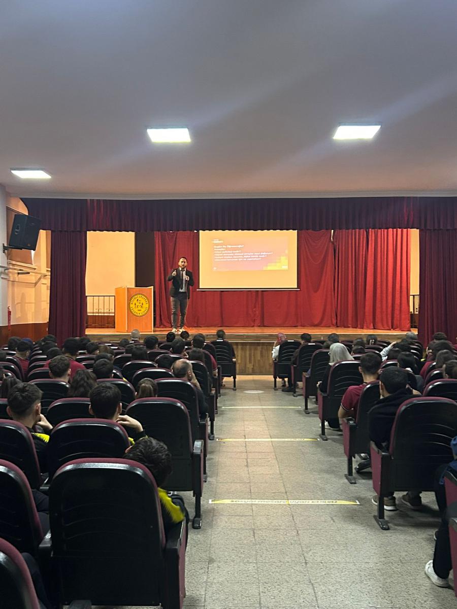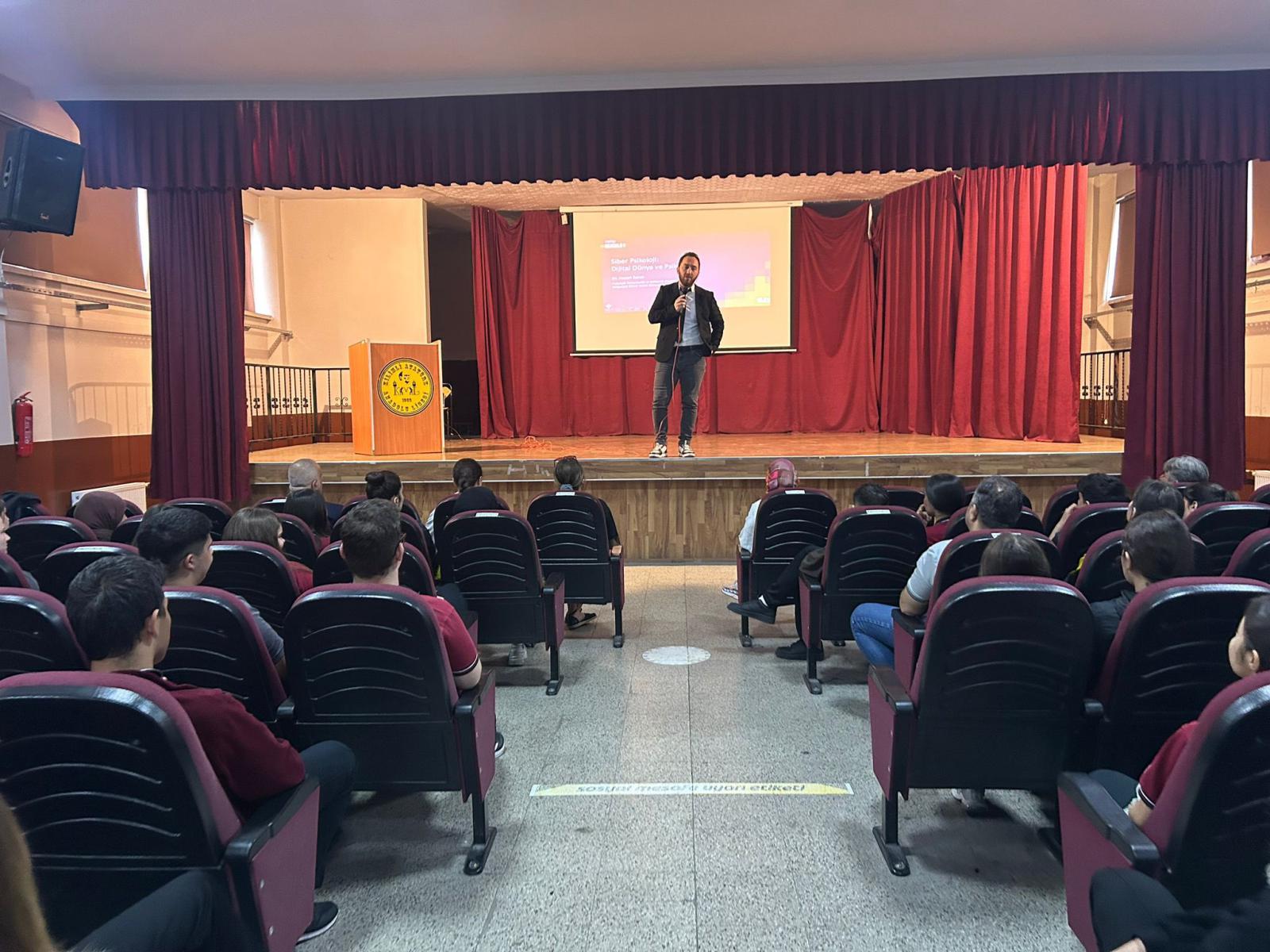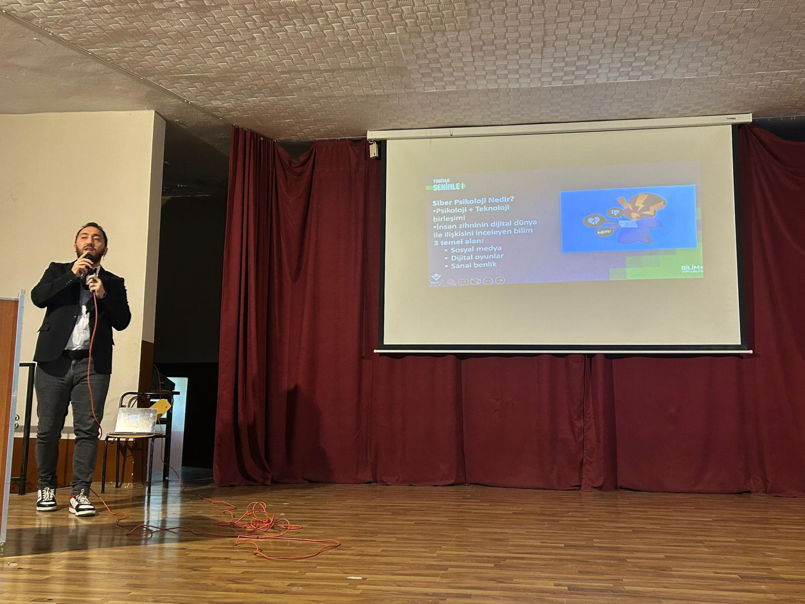 Genç Ar-Ge programı kapsamında, 8 Mayıs 2025 tarihinde saat 11.00’de Kilimli Anadolu Lisesi Konferans Salonu’nda anlamlı ve bilgilendirici bir etkinlik gerçekleştirildi. TÜBİTAK Bilim Söyleşileri çerçevesinde düzenlenen bu etkinliğe, Zonguldak Bülent Ecevit Üniversitesi Arş. Gör. Hasan Sarıcı konuk konuşmacı olarak katıldı. “Siber Psikoloji: Dijital Dünya ve Psikoloji” konulu söyleşide, teknolojinin insan psikolojisi üzerindeki etkileri kapsamlı bir şekilde ele alındı. Özellikle dijital bağımlılık, sosyal medya kullanımı, çevrim içi kimlik inşası, sanal ilişkiler ve dijital ortamlarda yaşanan psikolojik değişimler gibi günümüzün önemli konuları üzerinde duruldu. Hasan Sarıcı, dijital dünyanın bireylerin düşünce yapısını ve davranışlarını nasıl dönüştürdüğünü örneklerle anlatarak, dijital çağda psikolojik dayanıklılığın ve dijital farkındalığın önemine dikkat çekti. Öğrenciler söyleşiye yoğun ilgi gösterdi; sunumun ardından gerçekleştirilen soru-cevap bölümünde aktif katılım sağladılar. Toplamda 12 öğretmen ve 200 öğrencinin katıldığı bu bilimsel etkinlik, gençlerin dijital dünyayı daha bilinçli ve sağlıklı bir şekilde değerlendirmelerine katkı sağladı. Etkinlik sonunda konuşmacıya teşekkür edildi ve katılımcılara bilgilendirici içerikler sunuldu.