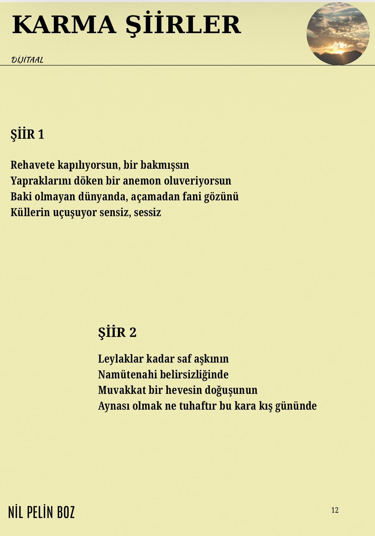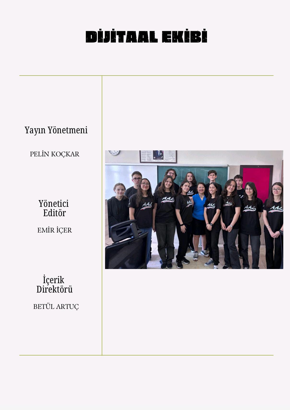 Antalya Anadolu Lisesi, özgün dijital dergisi "DIJITAAL"ın 3. sayısını okurlarıyla buluşturdu. Tamamen dijital formatıyla, geleneksel ve moderni bir araya getirmeyi hedefleyen dergi, eş zamanlı olarak tüm dünyada erişilebilir olmasıyla dikkat çekiyor. 20 kişilik genç ve dinamik bir ekip tarafından hazırlanan derginin teknik ve içerik editörlüğünü 9. sınıf öğrencilerimiz Emir İçer ve Betül Artuç üstlenirken, dergi kadrosunda yer alan 5 kişilik bir ekip de proje geliştirmeden sorumlu. Genel Yayın Yönetmenliğini ise okulumuzun Türk Dili ve Edebiyatı Öğretmeni Pelin Koçkar yürütüyor. DIJITAAL'ın 3. sayısında zengin bir içerik yelpazesi sunuluyor: *6 şiir *1 gezi yazısı *Kilim dokuma geleneğini anlatan 1 video *Mezun öğrencilerimizle yapılan 2 röportaj *2 deneme *1 makale *Rusça biyografi *Almanca şiir *İngilizce şiir Bu çeşitli içeriklerle DIJITAAL, öğrencilerin farklı alanlardaki yeteneklerini sergilemelerine olanak tanırken, okuyucularına da keyifli ve bilgilendirici bir deneyim sunuyor.