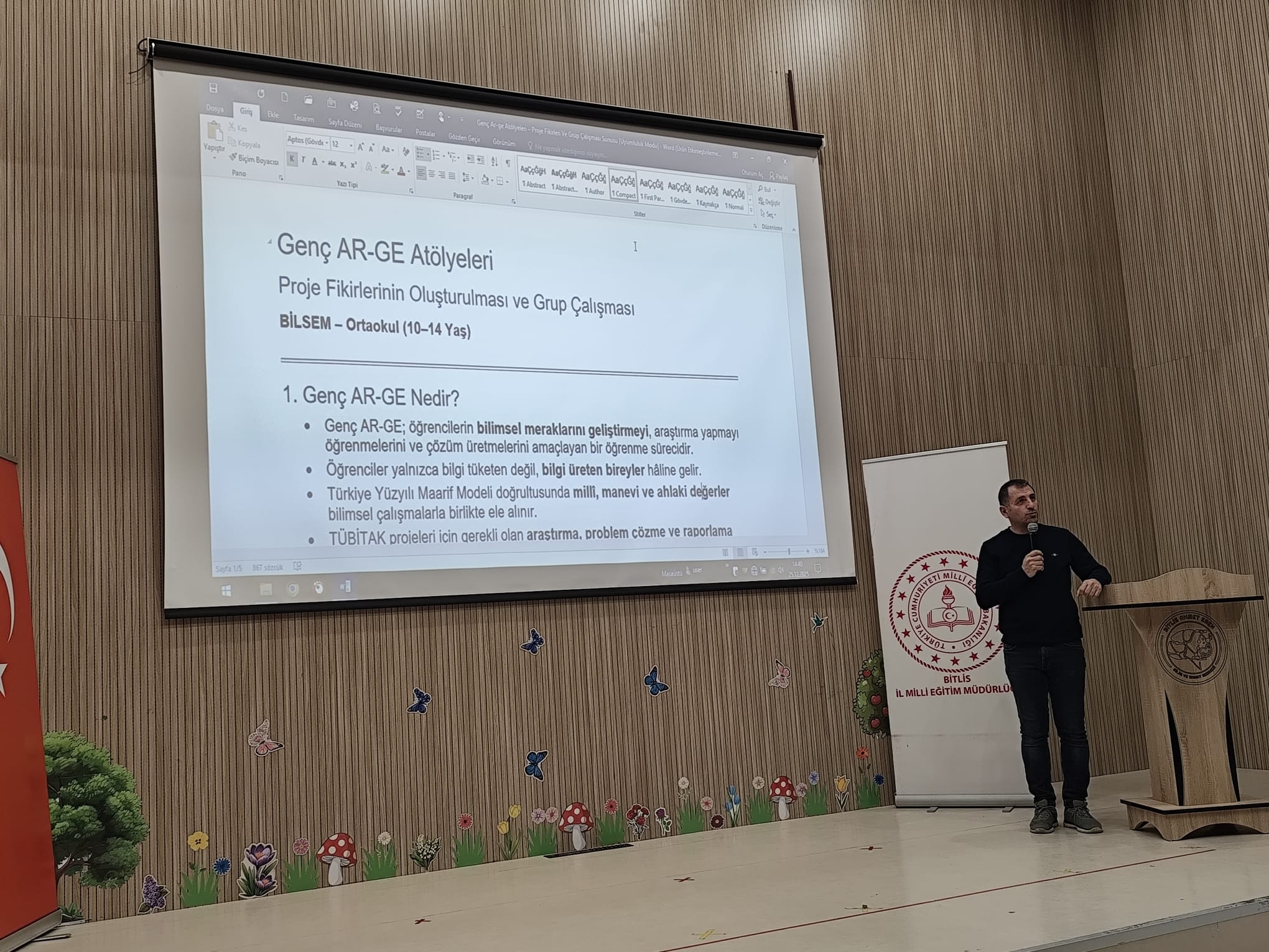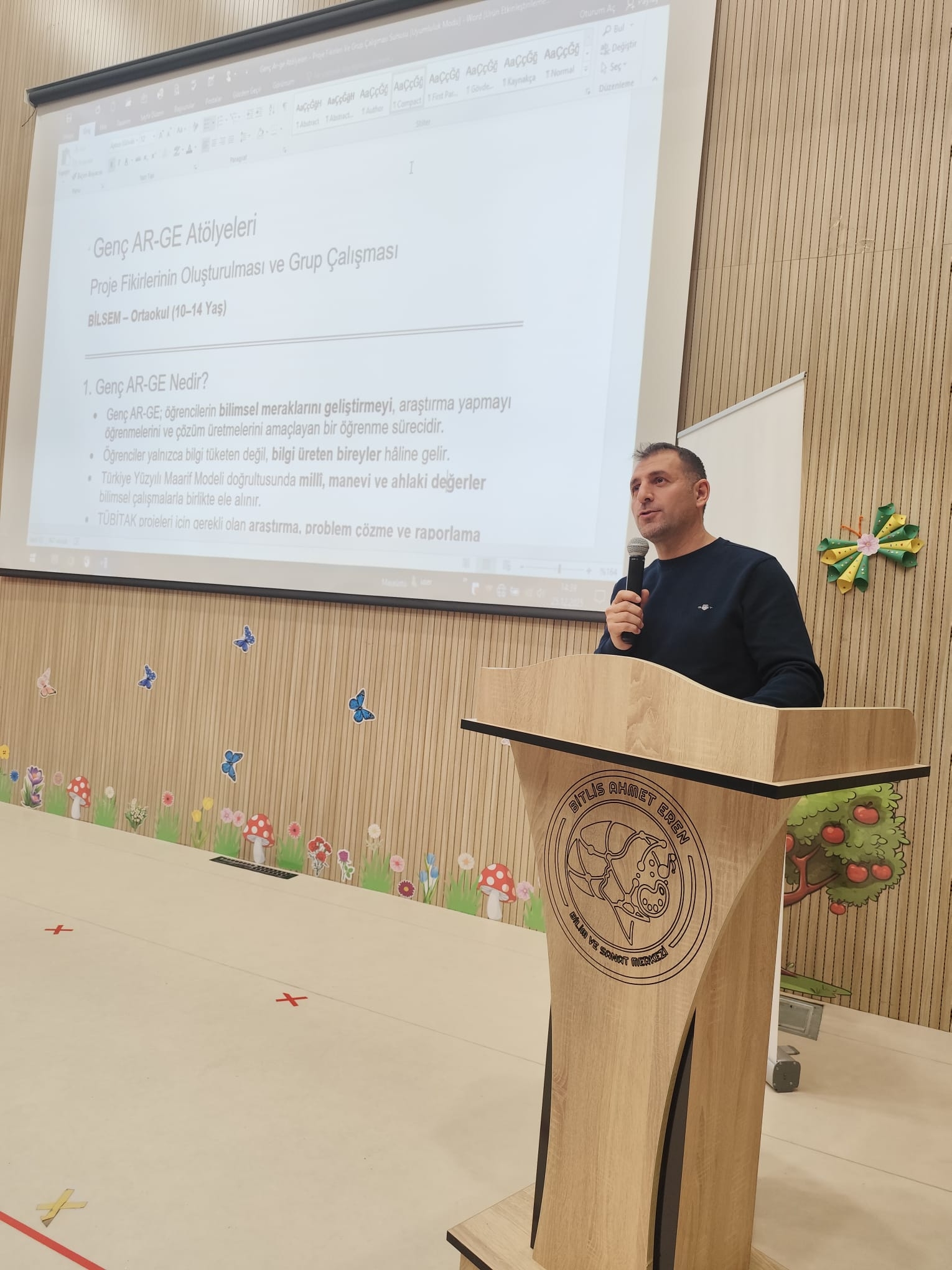 Genç AR-GE Etkinlikleri kapsamında düzenlenen yeni atölye çalışmamızda bir araya geldik. Etkinlikler çerçevesinde gerçekleştirilen “Proje Fikirlerinin Oluşturulması ve Grup Çalışması” atölyesi, Bitlis Eren Üniversitesi Mimarlık ve Mühendislik Fakültesi öğretim üyesi Doç. Dr. Vedat Tümen’in geniş içerikli sunumuyla gerçekleştirildi. Atölye kapsamında katılımcılara; örnek proje fikirlerinin oluşturulması, alan temaları ve grup içi görev dağılımları hakkında temel bilgilendirmeler yapıldı. Katılımcı öğretmen ve öğrenciler, yaratıcı düşünme ve araştırma etiği konularında canlı deneyimler yaşayarak etkileşimli bir atölye ortamı oluşturdu. Öğretmen ve öğrencilerimiz, örnekler üzerinden çıkarımlarda bulunarak geliştirilebilecek projeler üzerine ortak bir düşünce atmosferi oluşturdu. Atölye çalışmasına 34 öğrenci ve 17 öğretmen aktif olarak katılım sağladı. Bir sonraki atölyemizde buluşmak dileğiyle…