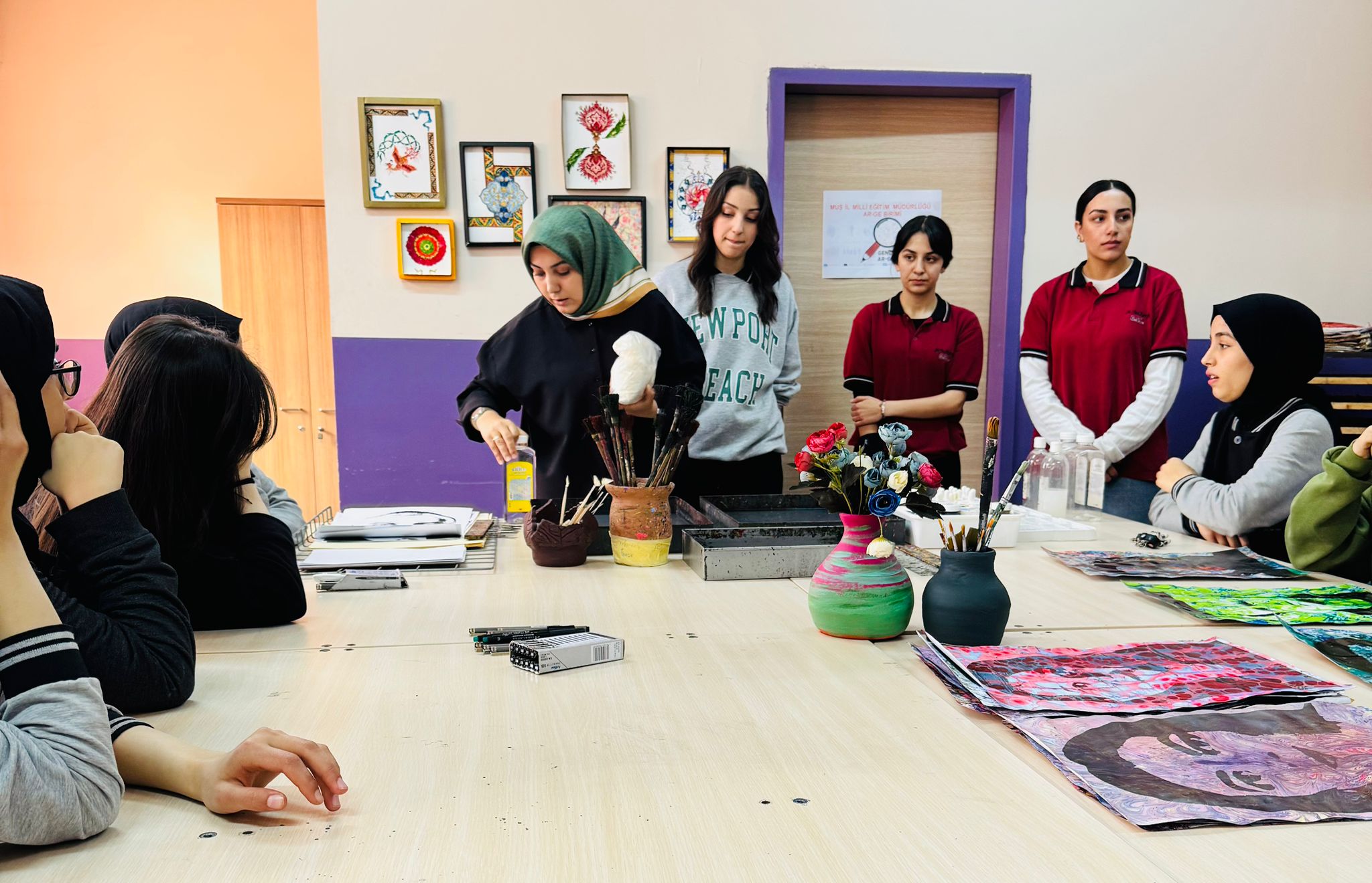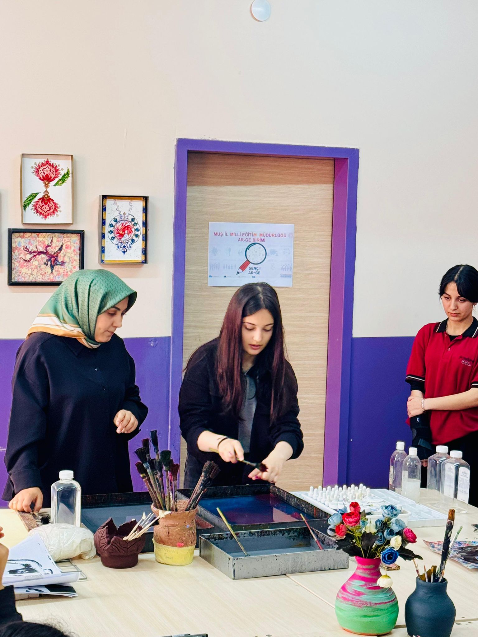 Muş Milli Eğitim Müdürlüğü Ar-Ge Birimi'nin ‘Genç Ar-Ge’ çalışmaları kapsamında Şehit Yücel Kurtoğlu Güzel Sanatlar Lisesi'nin ev sahipliğinde düzenlenen Ebru-Hat Workshop etkinliği yoğun ilgi gördü. Şehit Davut Karaçam Kız Anadolu İmam Hatip Lisesi öğrencilerine yönelik organize edilen Ebru-Hat Workshop etkinliği, hem geleneksel Türk sanatlarına olan ilgiyi artırmayı hedefliyor hem de öğrencilere disiplinler arası bir sanat deneyimi sunuyor.Etkinlik kapsamında grafik tasarım derslerinde öğrencilerin çizdiği portreler, detaylandırma aşamasında rapido kalemlerle incelikle işleniyor. Bu sürecin ardından öğrenciler, ebru atölyesinde portreleri renklendirerek sanatsal yorumlarını tuvale aktarıyor. Ebru ve hat sanatının birleştiği bu yaratıcı süreç, katılımcılara yalnızca teknik bir kazanım değil aynı zamanda sanatsal bir farkındalık da kazandırıyor. Projenin amacı, öğrencilerin hem geleneksel Türk sanatlarını hem de modern sanatsal yaklaşımları deneyimlemelerine imkân sunmak.Projemizde, grafik dersinde düzenledikleri portreleri daha sonra rapito kalemler ile o portrelerin düzenlenmesi ve sonrasında da ebru atölyesinde renklendirme işlemlerini yapıyoruz. Hâlâ bu çalışmalarla beraber ebru atölyesinde farklı materyaller üzerinde ebrularımızı yapıyoruz. Geleneksel Türk sanatları ve çağdaş sanatları bir arada yürütme adına bunları yapıyoruz. Bu yöntemle öğrencilerimizin hem iki sanata da yönelmelerini, hem de ikisini bir arada kullanabilmelerini sağlamaya çalışıyoruz.100 öğrencimiz bu anlamda eğitim almış ve atölye çalışmalarına katılmıştır.