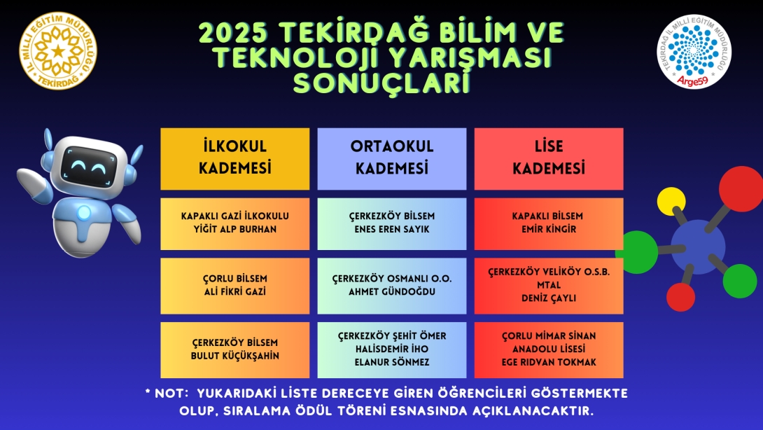 Tekirdağ İl Millî Eğitim Müdürlüğü tarafından organize edilen “Tekirdağ Bilim ve Teknoloji Yarışması”na ilişkin değerlendirme süreci tamamlanmış olup, yarışmanın sonuçları resmen ilan edilmiştir. Söz konusu yarışma, il genelinde ortaöğretim öğrencilerinin bilimsel araştırma, teknoloji üretimi ve yenilikçi proje geliştirme alanlarındaki yetkinliklerini artırmayı hedeflemektedir. Yarışmaya toplam 296 öğrenci katılım sağlamış, sunulan projeler alanında uzman seçici kurul tarafından belirlenen kriterler doğrultusunda titizlikle değerlendirilmiştir. Değerlendirme kriterleri arasında; bilimsel yöntemlerin etkin kullanımı, özgünlük, projelerin uygulanabilirliği ve sunum kalitesi yer almıştır. Başarılı bulunan projeler farklı kategorilerde ödüllendirilmiş, dereceye giren öğrencilere ve danışman öğretmenlere ödülleri takdim edilmiştir. Ayrıca, yarışmada sergilenen nitelikli projelerin yaygınlaştırılması ve ilgili kurumlar ile iş birliği içerisinde desteklenmesi hususunda çalışmalar başlatılmıştır.