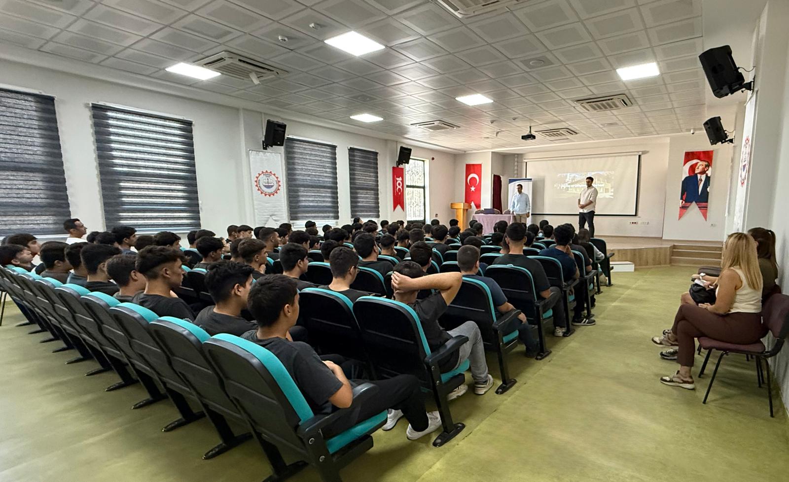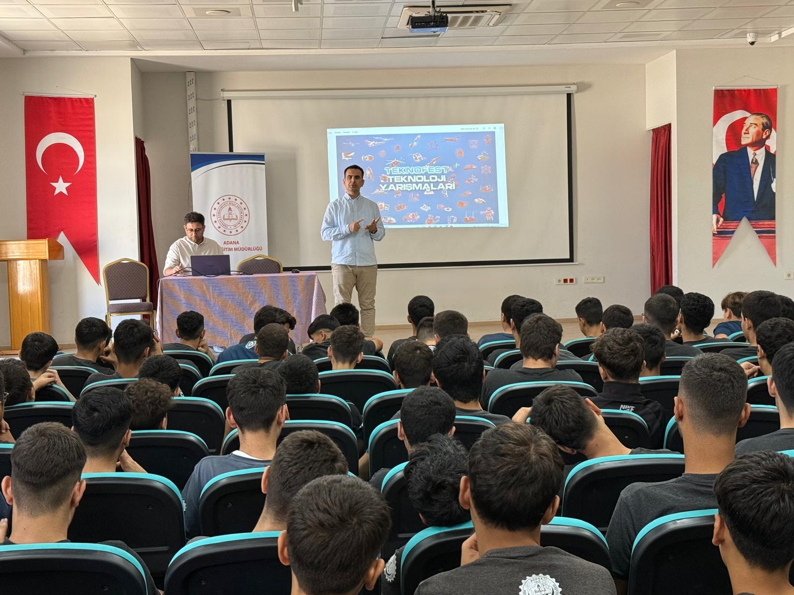Millî Eğitim Bakanlığı Strateji Geliştirme Başkanlığı tarafından yürütülen “GENÇ AR-GE Projesi”, öğrencilerin erken yaşlarda yetenek ve kapasitelerinin keşfedilmesi, bilimsel, teknolojik ve mesleki alanlarda kabiliyetlerini geliştirebilecekleri çalışmalara yönlendirilmesi, bu kapsamdaki eğitim-öğretim uygulamalarına katılımlarının desteklenmesi ve genç araştırmacılar yetiştirilmesini amaçlamaktadır. Bu kapsamda, İl Millî Eğitim Müdürlüğümüz AR-GE Birimi tarafından; 26.09.2025 tarihinde Adana Mesleki ve Teknik Anadolu Lisesi konferans salonunda 100 öğrenciye yönelik proje eğitimleri gerçekleştirilmiştir. Söz konusu eğitimlerde: • Girişimcilik, • TEKNOFEST Teknoloji Yarışmaları, • TÜBİTAK Lise Öğrencileri Araştırma Projeleri Yarışması alanlarında bilgilendirme yapılmış; öğrencilerin proje üretme, araştırma yapma ve yenilikçi fikirlerini geliştirme süreçlerine katkı sağlanmıştır. Gerçekleştirilen bu faaliyetler ile öğrencilerin potansiyellerinin ortaya çıkarılması, araştırma-geliştirme odaklı çalışmalara yönlendirilmesi ve onların geleceğin bilim insanları, girişimcileri ve araştırmacıları olarak yetiştirilmeleri hedeflenmektedir.