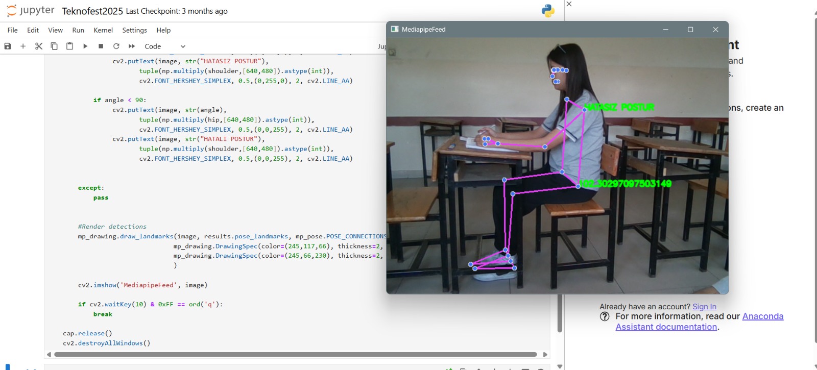 Cumhuriyet Mesleki ve Teknik Anadolu Lisesi Genç Argeci Öğrencileri Teknoloji Tasarlıyor. TEKNOFEST Genç Ar-Ge ruhuyla geliştirdiğimiz bu projede, 6 öğrencimiz oturuş bozukluklarını tespit etmeye yönelik bir yazılım tasarlandı. Python dili ve MediaPipe kütüphanesi kullanılarak anlık görüntü işleme yapılmakta ve duruş analizine dayalı hesaplamalar gerçekleştirilmektedir. Yazılım, kameralı laptoplarda test edilmiş olup, Python ve kamera desteği bulunan tüm cihazlarda çalışabilecek yapıdadır. Proje, gençlerin teknoloji üretme yetkinliğini artırmayı, sağlık alanında farkındalık oluşturmayı ve yapay zekâ destekli çözümlerle erken müdahale fırsatları yaratmayı amaçlamaktadır. Bu çalışma, gençlerin Ar-Ge sürecine aktif katılımını teşvik etmektedir.