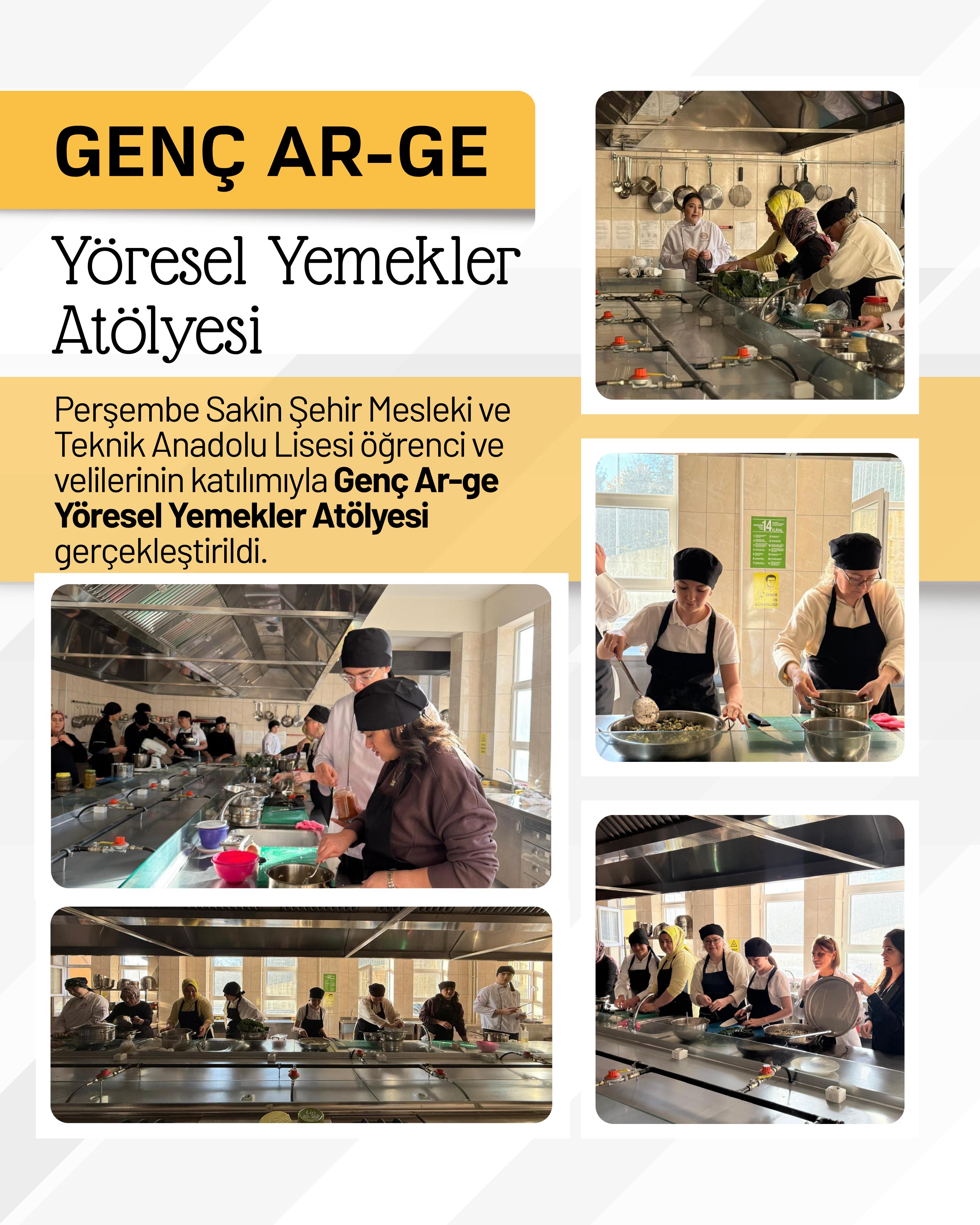 Genç Ar-Ge etkinlikleri kapsamında Ordu ili Perşembe ilçesinde bulunan Sakin Şehir Mesleki ve Teknik Anadolu Lisesinde Yöresel Yemekler Atölyesi gerçekleştirildi. Atölyede, okulun mutfak bölümü öğretmenleri gözetiminde 10 öğrenci ve 10 veli birlikte yöresel yemekler yapıldı. Ordu yöremize özel melocan kavurması, kaldirik kavurması, kaldirik turşusu, kara lahana çorbası, ordu yağlısı, mısır ekmeği, cevizli helva, kara lahana sarması, sakarca gibi yemekler okulun mutfağında öğrenciler ve velilerle birlikte pişirildi. Velilerimiz öğrencileri ile birlikte yemek yapma fırsatı buldukları için sevinçli olduklarını ifade ettiler. Renkli görüntülerin oluştuğu atölyede pişirilen yemekler misafirlerin beğenisine sunuldu. Yönetici, öğretmen, öğrenci ve velilerimize teşekkür ederiz.