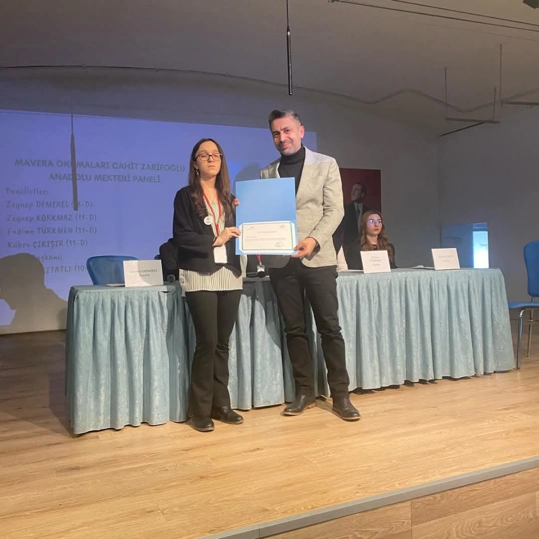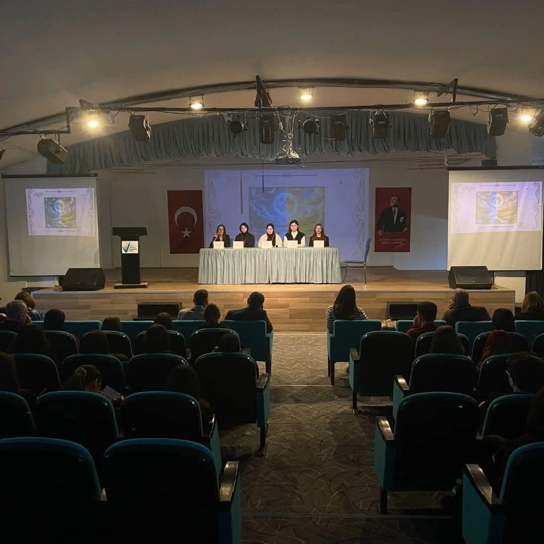 Okulumuz Eti Sosyal Bilimler Lisesi, Genç AR-GE faaliyetleri ve Anadolu Mektebi Yazar Okumaları projesi kapsamında, edebiyatımızın usta isimlerinden Cahit Zarifoğlu’nun eserlerini mercek altına alan "Mavera Okumaları - Cahit Zarifoğlu Paneli"ne ev sahipliği yaptı. Bu derinlikli etkinlik, öğrencilerimizin edebi analiz ve eleştirel düşünme yeteneklerini pekiştirmeyi amaçladı. Panelde sahne alan öğrencilerimiz, Cahit Zarifoğlu’nun farklı eserlerini kendi özgün bakış açılarıyla değerlendirerek izleyicilerle paylaştılar. Genç panelistler, Zarifoğlu’nun eserlerindeki insan ve doğa ilişkisi, metaforik anlatım, çocukluk teması ve manevi arayış gibi derin konuları başarıyla analiz ederek dinleyicilere aktardılar. Etkinliğin akademik danışmanlığını üstlenen Osmangazi Üniversitesi Türk Dili ve Edebiyatı Öğretim Üyesi Doç. Dr. Deniz Depe, öğrencilerin analiz ve yorumlarına yönelik kapsamlı bir değerlendirme konuşması yaptı. Doç. Dr. Depe, öğrencilerin Zarifoğlu’nun eserlerinde öne çıkardığı temaların isabetliliğini vurgulayarak, karakterlerin psikolojik yansımaları ve sanatçının edebi kimliği üzerine yapılan yorumları akademik bir bakış açısıyla ele aldı. "Genç AR-GE"nin bilimsel merakı ile "Anadolu Mektebi"nin kültürel derinliğini birleştiren bu panel, öğrencilerimizin eleştirel düşünme, edebi analiz ve özgün ifade etme becerilerini pekiştirmelerine büyük katkı sağladı. Önümüzdeki dönemde farklı yazarların eserlerinin ele alınacağı benzer panellerin devam etmesi planlanmakta olup, bu tür etkinliklerle öğrencilerimizin kültürel gelişimini desteklemeye devam edeceğiz.