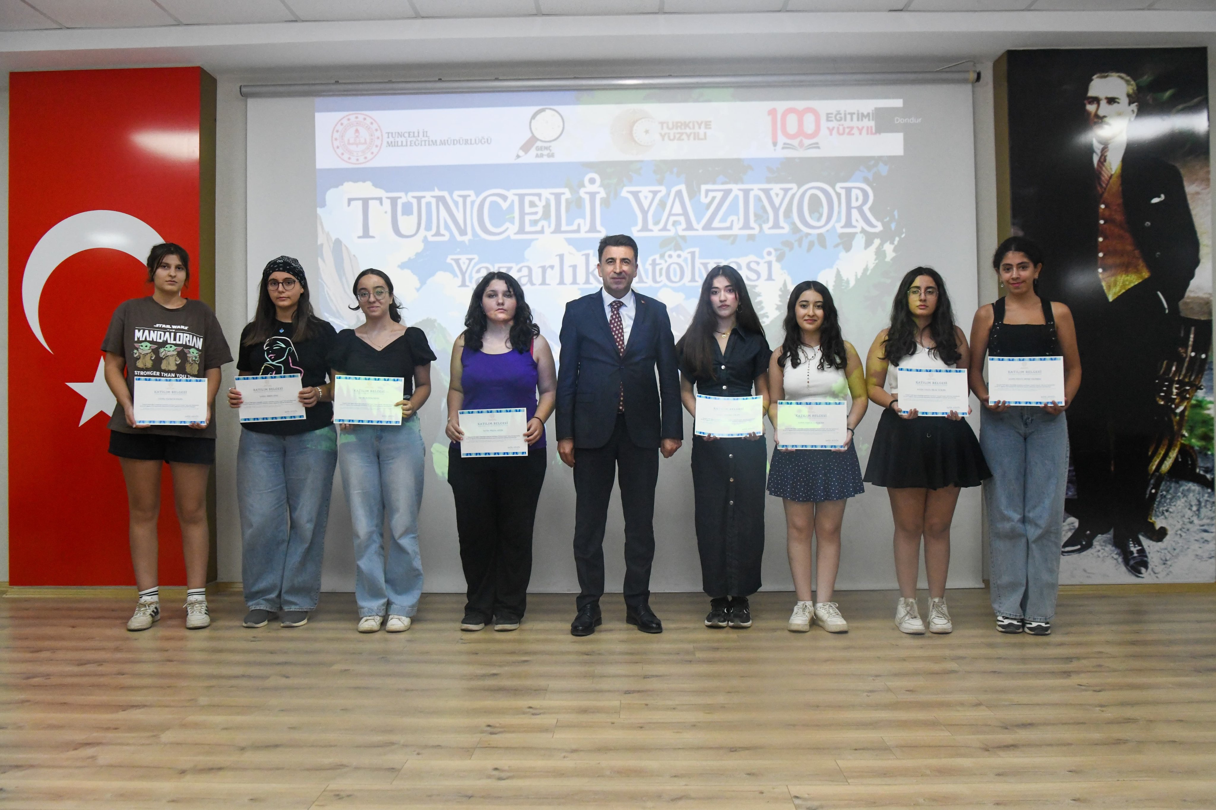 Tunceli İl Millî Eğitim Müdürlüğü tarafından gerçekleştirilen "Tunceli Yazıyor" projesi, öğrencilerimizin yaratıcı yazarlık becerilerini geliştirmeyi, düşüncelerini özgün biçimde ifade etmelerini desteklemeyi ve edebiyatla kurdukları bağı güçlendirmeyi amaçlayan bir eğitim programıdır. 25, 26, 27 Ağustos tarihlerinde gerçekleştirilen bu çok oturumlu atölye dizisi, alanında uzman yazar ve editörlerle uygulanmıştır. Yazarlık atölyelerinde; edebiyatın tarihsel gelişimi, hikâye yazmaya başlamadan önce sorulması gereken sorular, ilham kaynakları, kurgu oluşturma teknikleri, anlatım biçimleri, görselleştirmenin önemi ve yayınevlerinin çalışma süreçleri gibi başlıklar ele alınmıştır. Her oturum, teorik bilginin yanı sıra öğrencilerimizin aktif katılım sağladığı yaratıcı yazarlık uygulamalarıyla desteklenmiştir. Masal yazımı, kelime temelli hikâye üretimi, kitap kapağı tasarımı, diyalog yazımı ve kurgu iskeleti oluşturma gibi etkinliklerle öğrencilerimiz yazarlık sürecinin tüm aşamalarını deneyimleme imkânı bulmuşlardır. Ayrıca yayınevi işleyişiyle ilgili oturumda çocuklar, kitapların yazımından yayımlanmasına uzanan yolculuğu da yakından tanıma fırsatı bulmuşlardır. "Tunceli Yazıyor"; düşünen, hayal eden, yazan ve kendini yazıyla ifade edebilen bireyler yetiştirmeye yönelik önemli bir adım olarak tasarlanmıştır. Proje Tunceli Şehit Öğretmen Necmettin Yılmaz Öğretmenevinde gerçekleştirilmiştir. GENÇ AR-GE kapsamında planlanan projemize küçük yaş grubundan öğrencilerimiz de ilgi göstermiştir. GENÇ AR-GE kapsamında toplam 32 öğrencimizin katılım sağladığı atölye dizisi kapanışında toplam 50 öğrencimize katılım sertifikası verilmiştir. Program içeriği şöyledir: Kelimelerin Gücü ve Kadim Öyküler: Feride BAYYİĞİT Hayalini Çiz, Kapağını Tasarla: Gülfem ÖZER Hikâye Avcılığı: Süper Fikirleri Nasıl Yakalarız: Şeniz BAŞ Kitabımız Hayat Buluyor: Feride BAYYİĞİT Kelimelerin Gücü: Ömür UZEL Hikâye Haritamızı Çiziyoruz: Sevde Tuba OKÇU