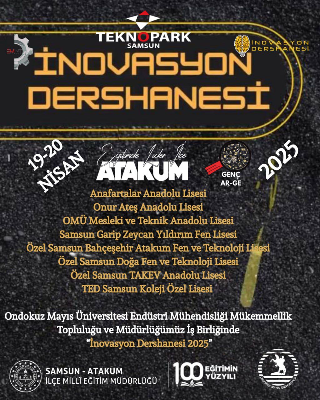 Bakanlığımız Genç AR-GE faaliyetleri kapsamında, öğrencilerimiz, Ondokuz Mayıs Üniversitesi Endüstri Mühendisliği Mükemmellik Topluluğu ve Atakum MEM İş Birliğinde “İnovasyon Dershanesi” atölye etkinliklerine katıldı. 19-20 Nisan 2025 tarihlerinde gerçekleştirilen etkinlikte öğrencilerimiz, yeni girişimcilik fikirleri, bilimsel ve teknolojik uygulamaların yer aldığı etkinlik ve atölye çalışmalarına katılarak keyifli zaman geçirdi. Elektrikli Araçlar sınıfından Borhan Tuğsan Balcı, Arın Deniz Arıkan; Yazılım Geliştirme sınıfından Asım Eren Topal, Siber Güvenlik sınıfından Faruk Şenel, Erenvasi Karaman ve Savunma Elektronik Sistemler sınıfından Zafer Berk adlı öğrencilerimizin interaktif katılım sağladığı etkinlikte öğrencilerimiz, OMÜ’lü Endüstri Mühendislerinden çeşitli eğitimler aldı.