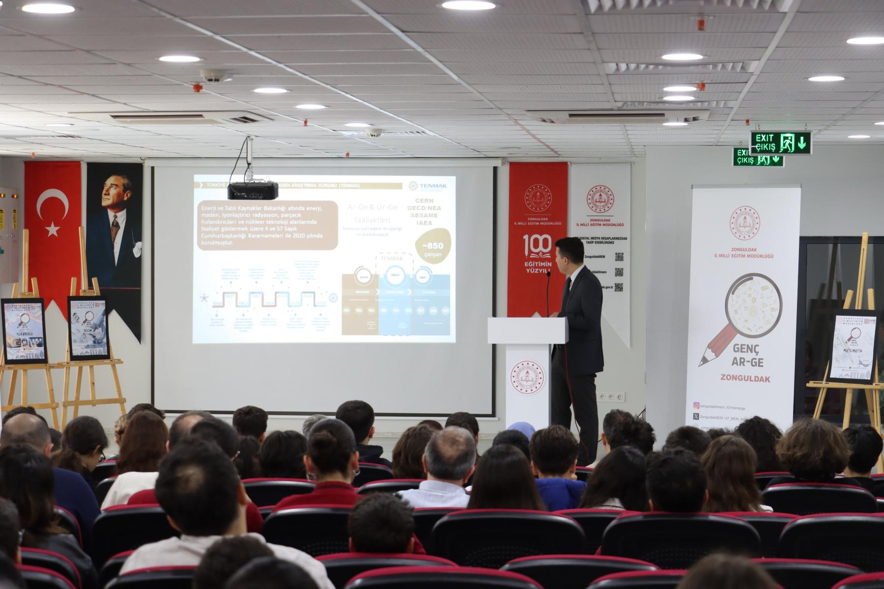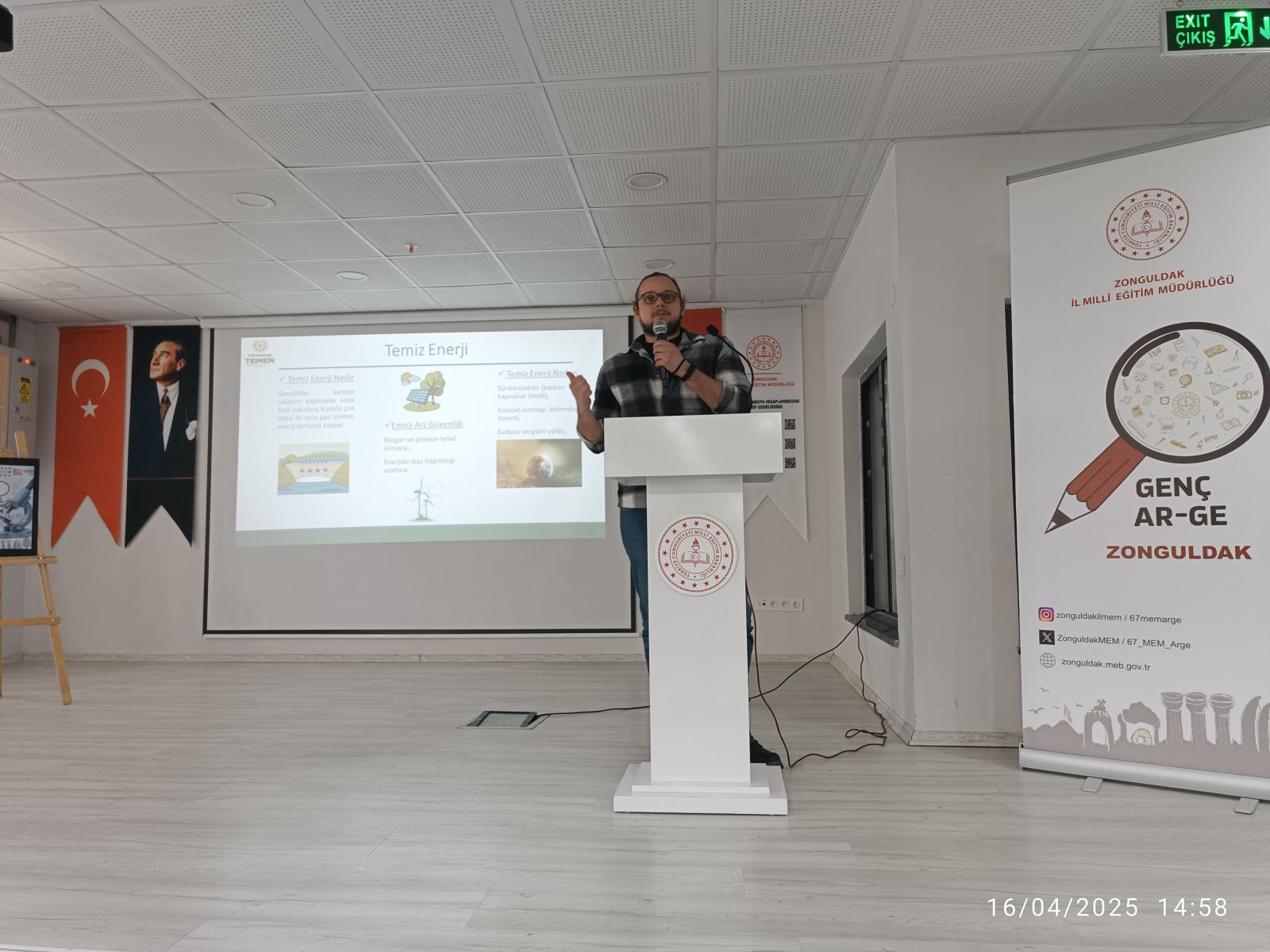 16 Nisan 2025 tarihinde, Zonguldak İl Millî Eğitim Müdürlüğü Konferans Salonu’nda Türkiye Enerji, Nükleer ve Maden Araştırma Kurumu (TENMAK) ile Temiz Enerji Araştırma Enstitüsü (TEMEN) iş birliğinde, Genç AR-GE faaliyetleri kapsamında "Temiz Enerji Teknolojileri" gerçekleştirilmiştir. Öğrencilerin bilimsel düşünme becerilerini geliştirmeyi amaçlayan etkinliğe Valimizin eşi Güney Hacıbektaşoğlu, İl Millî Eğitim Müdürümüz Osman Bozkan, Müdür Yardımcımız Cemile Gül, Türkiye Enerji, Nükleer ve Maden Araştırma Kurumu (TENMAK) ve Temiz Enerji Araştırma Enstitüsü (TEMEN) Ar-Ge Uzmanları Sayın Dr. İbrahim Ateş ve Sayın Dr. Enis Furkan Uçar, 25 okuldan 25 öğretmen, 10 Ar-Ge öğretmeni ve 111 öğrenci katılım sağlamıştır. Üç oturumdan oluşan seminerin ilk oturumunda, Dr. İbrahim Ateş "Ülkemizde Hidrojen Teknolojileri Ar-Ge Üssü: TENMAK TEMEN" konulu sunumunu gerçekleştirmiştir. İkinci oturumda, Dr. Enis Furkan Uçar "Temiz Enerji Teknolojileri: Güneş Hücreleri, Elektrolizör ve Yakıt Hücreleri" hakkında bilgi vermiştir. Üçüncü oturumda ise öğrencilerle soru-cevap seansı düzenlenmiştir. Toplam dört saat süren etkinlikte, katılımcılara hidrojen teknolojileri ve temiz enerji sistemleri hakkında kapsamlı bilgi sunulmuş; öğrencilerin bilimsel ve teknolojik gelişmelere olan ilgileri artırılmıştır. Seminer sonunda 111 öğrenci temiz enerji teknolojileri ve hidrojen teknolojileri alanında bilgi edinmiş ve bilinçlenmiştir.