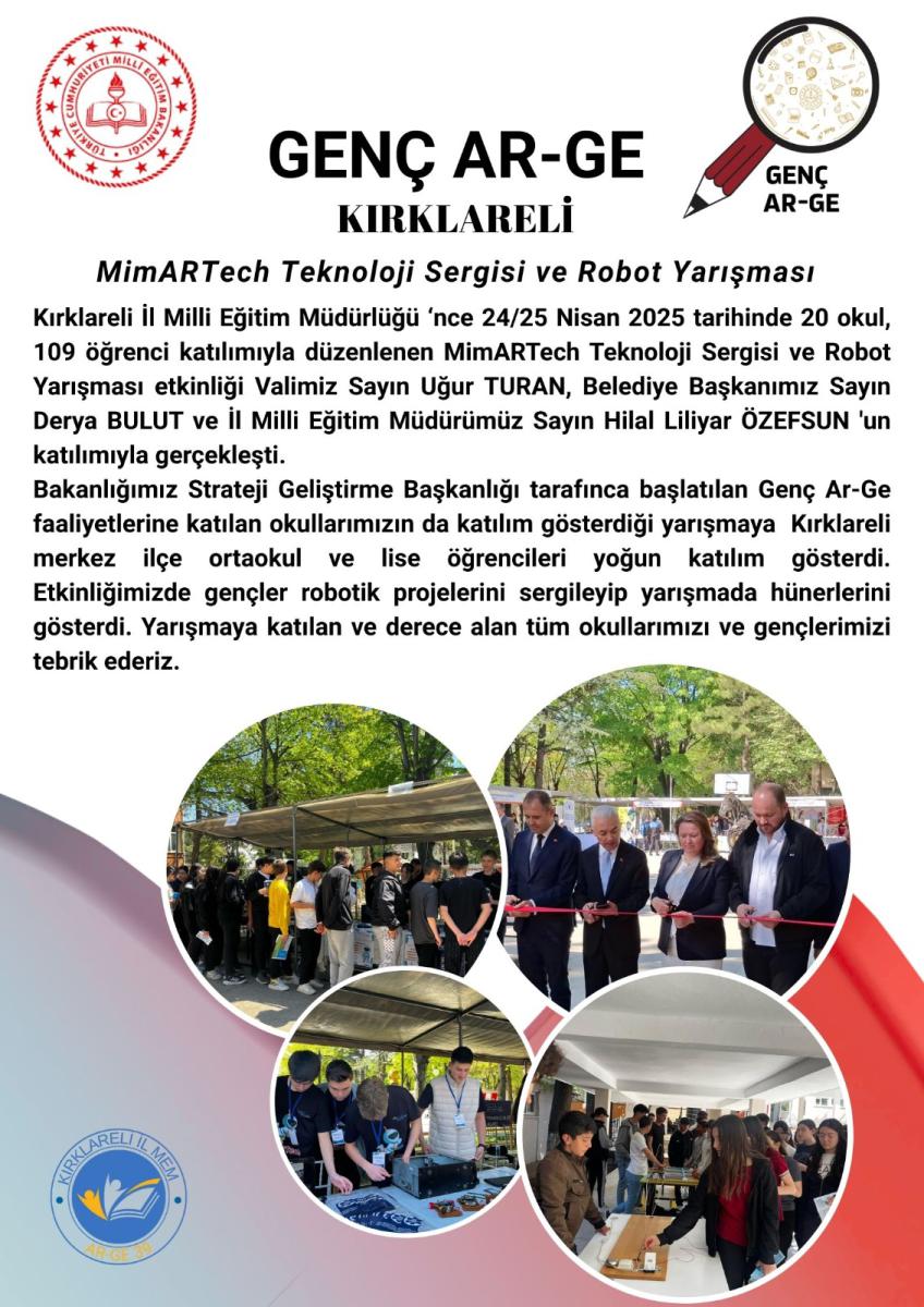 Kırklareli İl Milli Eğitim Müdürlüğü ‘nce 24/25 Nisan 2025 tarihinde 20 okul, 109 öğrenci katılımıyla düzenlenen MimARTech Teknoloji Sergisi ve Robot Yarışması etkinliği Valimiz Sayın Uğur TURAN, Belediye Başkanımız Sayın Derya BULUT ve İl Milli Eğitim Müdürümüz Sayın Hilal Liliyar ÖZEFSUN 'un katılımıyla gerçekleşti. Bakanlığımız Strateji Geliştirme Başkanlığı tarafınca başlatılan Genç Ar-Ge faaliyetlerine katılan okullarımızın da katılım gösterdiği yarışmaya Kırklareli merkez ilçe ortaokul ve lise öğrencileri yoğun katılım gösterdi. Etkinliğimizde gençler robotik projelerini sergileyip yarışmada hünerlerini gösterdi. Öğrencilerimizin tasarladığı projeler arasında yapay zekâ destekli robotlar, otonom araçlar, çevre dostu enerji sistemleri ve akıllı şehir çözümleri gibi çağın ötesinde fikirler yer aldı. Bu projeler, sadece teknik becerileri değil; aynı zamanda çevresel farkındalık, toplumsal katkı ve sürdürülebilirlik gibi değerleri de ön plana çıkardı. Yarışmaya katılan ve derece alan tüm okullarımızı ve gençlerimizi tebrik ederiz.