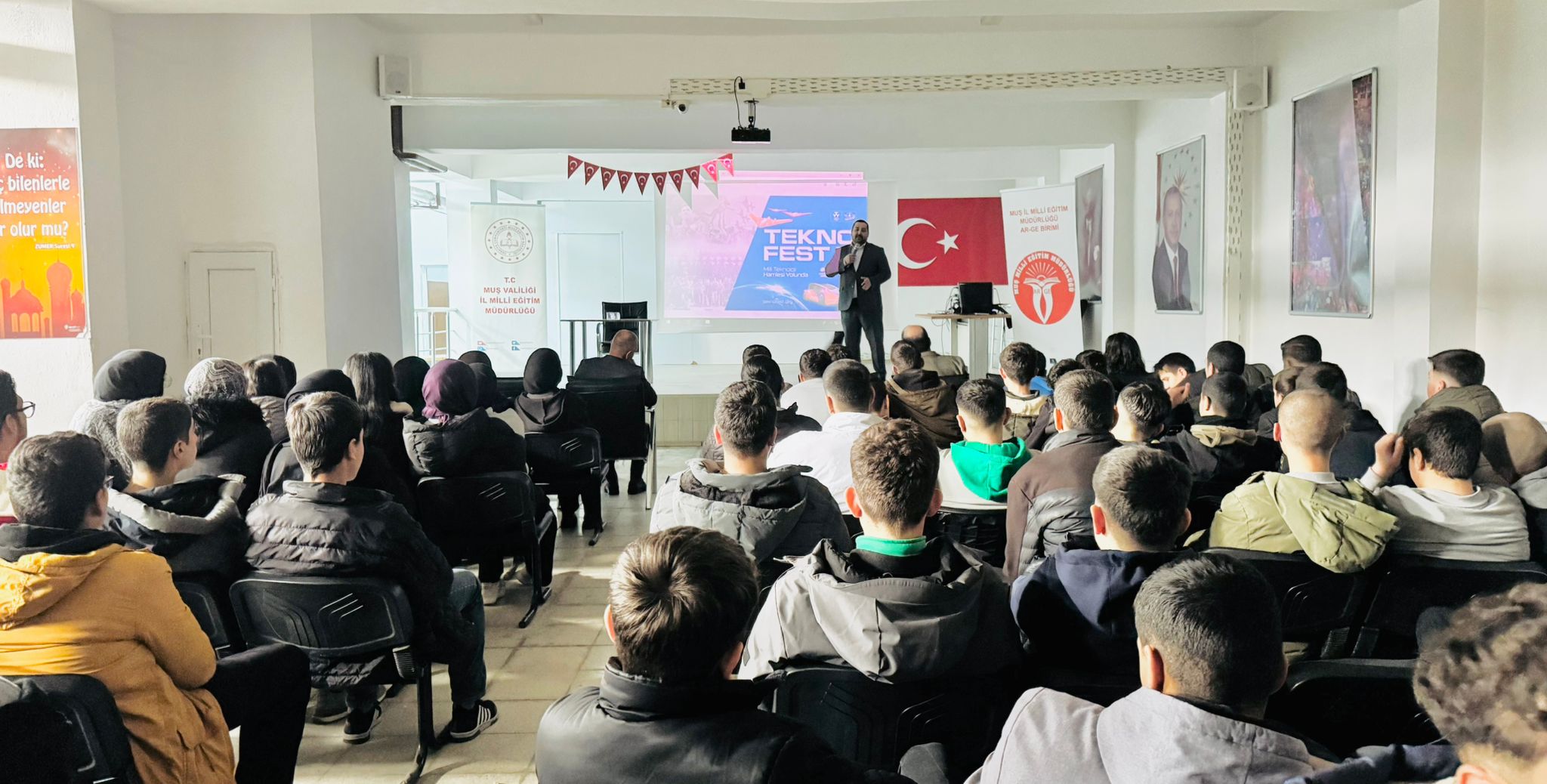 “TEKNOFEST Gelecek Sensin” programı kapsamında, farklı okullarımızda teknolojiye ilgi duyan öğrencilerimizle bir araya gelmeye devam ediyoruz. Bu doğrultuda düzenlenen programda, T3 Vakfı Muş İl Temsilcisi Doç. Dr. Salih ÖZER hocamızın TEKNOFEST süreçleri, proje geliştirme aşamaları ve gençler için sunulan fırsatlara ilişkin değerli sunumlarını dinleme imkânı bulduk. Program süresince öğrencilerimizin; bilim, teknoloji ve yenilikçilik alanlarına yönelik farkındalıklarının artırılması, TEKNOFEST yarışmalarına katılım konusunda motive edilmeleri ve proje üretme kültürünün yaygınlaştırılması hedeflenmiştir. Temel hedefimiz; Muş ilinde TEKNOFEST’e katılım sayısını daha ileri seviyelere taşımak, başta yapay zekâ, robotik ve kodlama olmak üzere teknoloji odaklı alanlarda öğrencilerimizin ve öğretmenlerimizin bilgi, beceri ve altyapılarını güçlendirmektir. Bu doğrultuda, geleceğin teknoloji liderlerini yetiştirmek adına çalışmalarımızı sürdürüyoruz .Programımız 200 öğrencinin katılımıyla gerçekleştirildi.