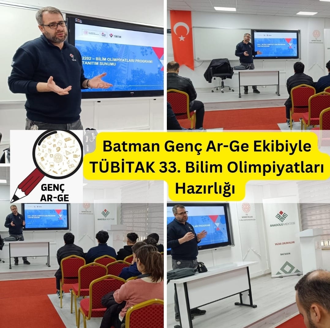 Batman İl Milli Eğitim Müdürlüğü bünyesinde faaliyet gösteren Genç Ar-Ge Ekibi, 2025 yılı TÜBİTAK 33. Bilim Olimpiyatları’na hazırlık süreci kapsamında önemli bir bilgilendirme toplantısına ev sahipliği yaptı. Toplantı, 26 Şubat 2025 tarihinde Batman İl Milli Eğitim Müdürlüğü Ar-Ge Biriminde gerçekleştirildi. Etkinlikte, TÜBİTAK’ın düzenlediği 33.Bilim Olimpiyatları Programı tanıtım sunumu yapıldı. Sunum, TÜBİTAK programlarının yapısı, başvuru süreçleri, değerlendirme kriterleri ve olimpiyatlara yönelik hazırlık sürecine dair kapsamlı bilgiler içerdi. Eğitim süreci boyunca özellikle matematik, fizik, kimya, biyoloji, bilgisayar ve yapay zekâ gibi disiplinlerde başarılı olan öğrencilere yönelik bilimsel derinlikte içerikler paylaşıldı. Toplantıya Batman Genç Ar-Ge ekibinden toplam 45 öğrenci aktif biçimde katılım sağladı. Bu öğrenciler, il genelinde farklı liselerden seçilerek oluşturulmuş ve bilimsel çalışmalara özel ilgi gösteren bireylerden oluşmaktadır. Sunumun sonunda öğrenciler, TÜBİTAK Bilim Olimpiyatları'na hazırlık sürecinde izlenecek adımlar konusunda bilgilendirildi ve altı aylık bir yol haritası açıklandı. Bu yol haritasında; haftalık konu tekrarları, çevrim içi deneme sınavları, bireysel mentorluk görüşmeleri, ileri düzey bilimsel okuma listeleri ve proje tabanlı uygulama oturumları yer almaktadır. Ayrıca, öğrencilerin motivasyonunu artırmak amacıyla her ay yapılacak seviye belirleme sınavlarıyla ilerleme düzeylerinin takip edileceği belirtildi. Sunumun gerçekleştirildiği salonda öğrenciler dikkatle sunumu takip ederken, sahnede yer alan büyük ekran üzerinden 2202 Bilim Olimpiyatları ile ilgili görsel materyaller ve örnek başarı hikâyeleri de paylaşıldı. Katılımcılar arasında öğretmenler, danışmanlar ve Genç Ar-Ge koordinatörleri de yer aldı. Etkinliğin sonunda öğrenciler sorular yönelterek süreç hakkında daha fazla bilgi aldı ve bire bir geri bildirim alma şansı yakaladı. Batman Genç Ar-Ge Ekibi, bu kapsamlı çalışmayla birlikte sadece TÜBİTAK’ın 33. Bilim Olimpiyatları’na değil, aynı zamanda bilimsel düşünce, araştırma disiplini ve ulusal düzeyde akademik başarıya da hazırlanmakta. Bu doğrultuda öğrencilere, haftada en az 8 saatlik ek çalışma programı, danışman öğretmenler tarafından önerildi. Bu tür çalışmalar, Batman’daki bilimsel farkındalığın artmasına katkı sunmakta ve gençlerin bilimsel üretkenliğe yönelmesini teşvik etmektedir. TÜBİTAK olimpiyatlarına hazırlık sürecinin başarıyla yürütülmesi, ilerleyen dönemlerde ulusal başarıların artmasında önemli rol oynayacaktır.