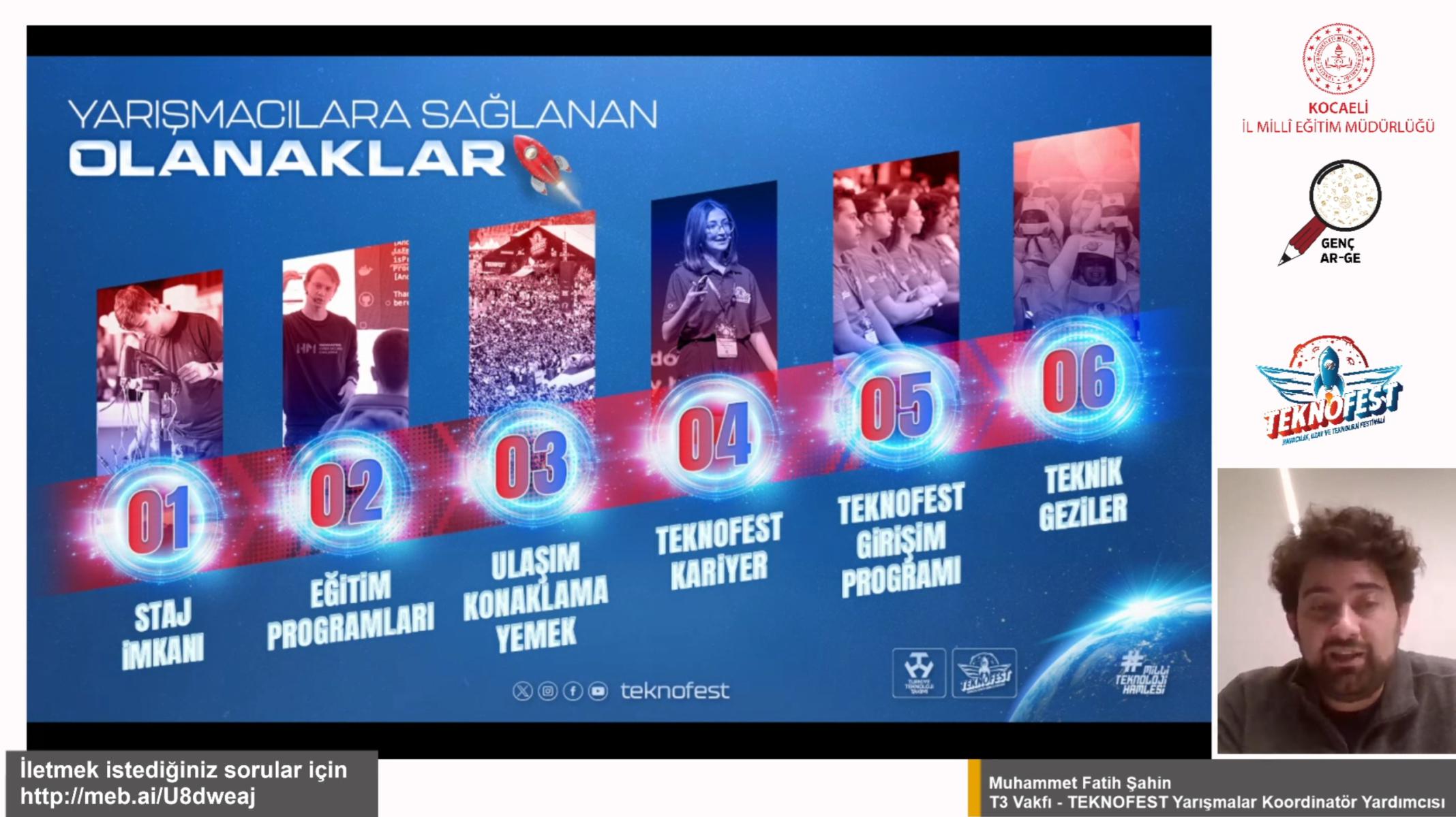 Müdürlüğümüz AR-GE birimi tarafından organize edilen “TEKNOFEST 2025 Teknoloji Yarışmaları Bilgilendirme Toplantısı”, 11 Şubat 2025 Salı günü saat 20.00’de Youtube kanalımız (www.youtube.com/c/KocaeliMilliEğitimARGE) üzerinden canlı olarak gerçekleştirildi. Programa T3 Vakfı TEKNOFEST Yarışmalar Koordinatör Yardımcısı Muhammet Fatih ŞAHİN konuk olarak katıldı. Öğrencilerimizin, öğretmenlerimizin ve velilerimizin yoğun ilgi gösterdiği yayında, TEKNOFEST 2025 kapsamında gerçekleştirilecek olan teknoloji yarışmaları hakkında kapsamlı bilgiler verildi. Özellikle öğrencilerin yarışmalara nasıl başvuru yapabilecekleri, hangi kategorilerde yarışabilecekleri ve sürece nasıl hazırlanabilecekleri detaylı şekilde anlatıldı. Ayrıca geçmiş yıllarda elde edilen başarı örnekleri paylaşıldı, merak edilen sorular yanıtlandı. Bu bilgilendirici etkinlik, gençlerimizin teknolojiye olan ilgisini artırmak ve onları sürece daha bilinçli şekilde dahil etmek amacıyla gerçekleştirildi.