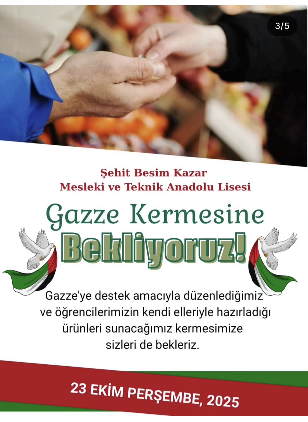 Okulumuz tarafından, Gazze'de yaşanan insani krize dikkat çekmek ve bölgedeki ihtiyaç sahibi vatandaşlara destek olmak amacıyla bir “Gazze’ye Yardım Kermesi” düzenlenmiştir. Etkinliğin temel amacı; öğrencilerde sosyal sorumluluk bilinci oluşturmak, yardımseverlik duygusunu güçlendirmek ve toplumsal dayanışmayı artırmaktır. Kermes, okul idaresi koordinasyonunda öğretmenlerin rehberliği, velilerin gönüllü katkıları ve öğrencilerin aktif katılımıyla başarıyla gerçekleştirilmiştir. Etkinlik kapsamında veliler tarafından hazırlanan yiyecek, el emeği ürünler ve çeşitli materyaller stantlarda satışa sunulmuş, yaklaşık 300 kişi etkinliğe katılım sağlamıştır. Kermesten elde edilen gelir, tamamen Gazze’deki ihtiyaç sahibi ailelere ulaştırılmak üzere ilgili yardım kuruluşlarına teslim edilmiştir. Bu çalışma sonucunda öğrencilerde empati, paylaşma ve dayanışma kültürü güçlenmiş, okul topluluğunda yardımlaşma ruhu daha da pekişmiştir.