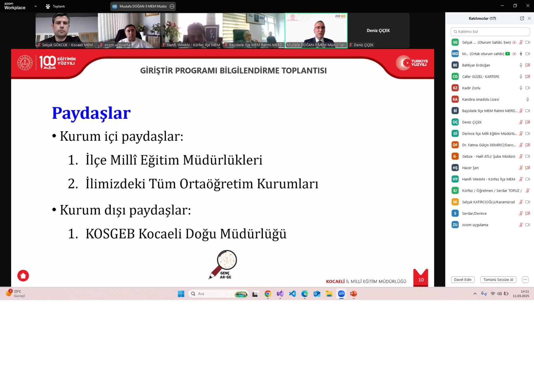 Girişimcilik, bireylere sadece kendi işlerini kurma fırsatı sunmakla kalmaz, aynı zamanda bireylerin yaratıcı düşünme, problem çözme ve risk alma gibi becerilerini de geliştirir. Aynı zamanda girişimcilik, yeni fikirlerin ve projelerin hayata geçirilmesini sağlayarak, ekonomiye canlılık katar ve rekabet gücünü artırır. On İkinci Kalkınma Planı(2024-2028)’nda birçok yerde girişimciliğe yer verilmesi, girişimciliğin desteklenmesi ve teşvik edilmesi girişimciliğin ülkemizin geleceği için stratejik bir önceliğe sahip olduğunu göstermektedir. Bu bağlamda Genç AR-GE programı kapsamında ortaöğretim kurumlarının öğrencilerine girişimcilik kültürü kazandırmayı, onları iş dünyasına ve kendi iş fikirlerini geliştirmeye hazırlamayı amaçlayan “Giriştir (Girişim İştir) Programı” başlatılmıştır. Müdürlüğümüz ve KOSGEB Kocaeli Doğu Müdürlüğü iş birliğiyle yürütülen bu program kapsamında ortaöğretim kurumlarının 11. sınıf öğrencilerinin KOSGEB tarafından ücretsiz olarak sunulan Geleneksel Girişimci Eğitimine katılmaları teşvik edilmekte, öğrencilerin girişimcilik konusundaki farkındalıkları arttırılmaktadır.