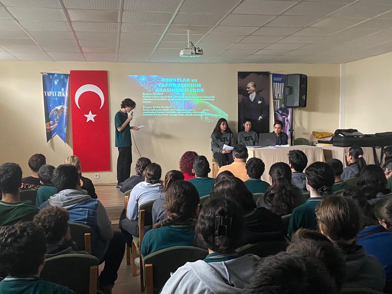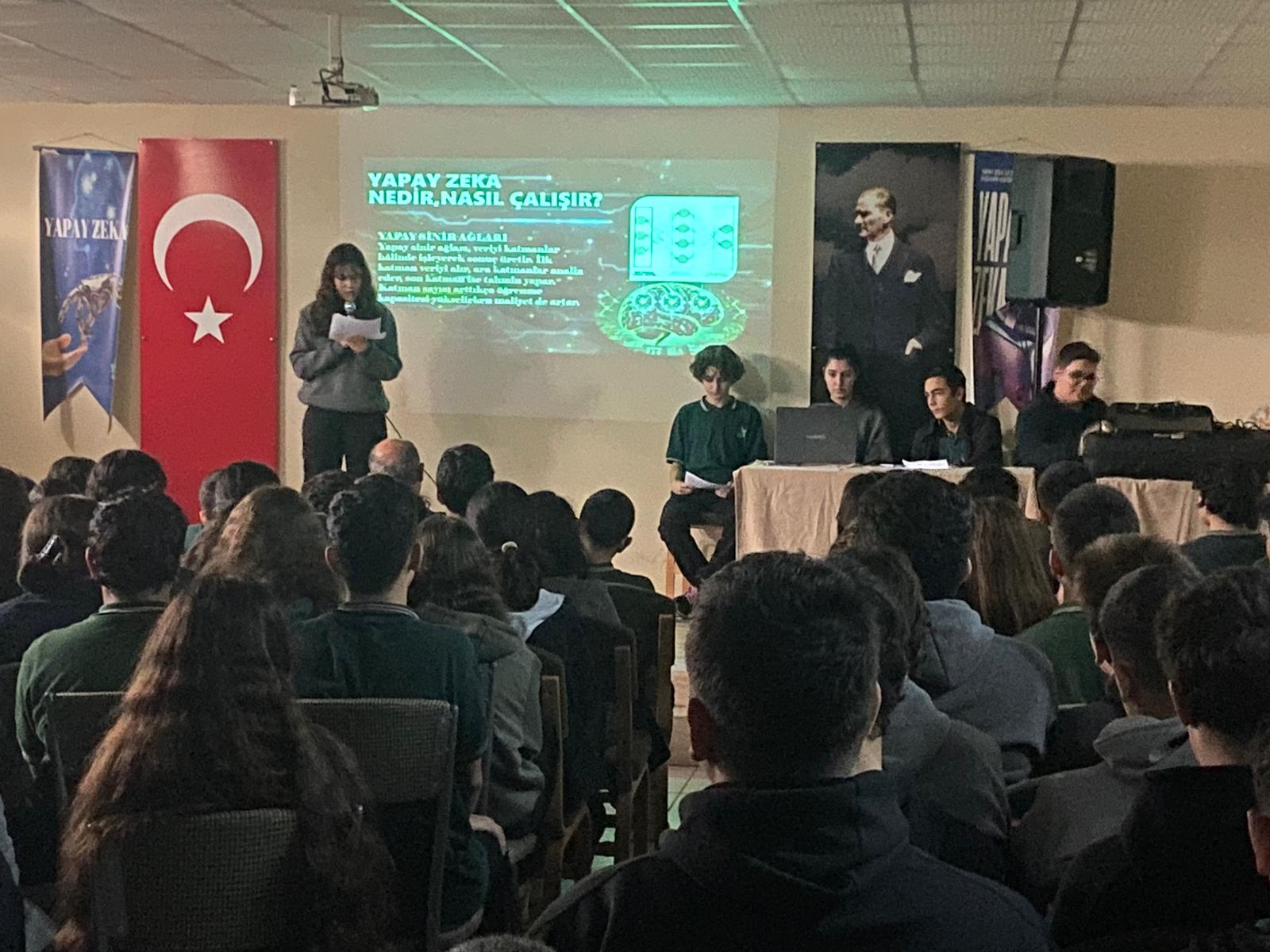 Köyceğiz İlçe Millî Eğitim Müdürlüğü koordinesinde düzenlenen “Yapay Zekâ Farkındalık Semineri”, lise düzeyindeki öğrencilerin yapay zekâ kavramını tanımalarını, günümüz dünyasında bu teknolojinin rolünü fark etmelerini ve gelecekteki meslek alanlarına dair bilinç kazanmalarını amaçladı. Seminerde öğrencilerin etik, sorumlu ve bilinçli teknoloji kullanımı konusunda farkındalık geliştirmeleri hedeflendi. 10. sınıflardan 15 öğrenci ve 5 öğretmenin katılımıyla gerçekleştirilen program üç ana başlıktan oluştu: Yapay Zekâya Giriş, Yapay Zekâ Teknolojileri, Gelecek, Etik ve Kariyer Alanları Öğrenciler seminer boyunca yoğun ilgi gösterdi; özellikle “Yapay Zekâ Meslekleri” ve “Etik Kullanım” konularında aktif şekilde sorular yöneltti. Katılımcıların büyük çoğunluğu seminerin kendilerinde yeni bir farkındalık oluşturduğunu ifade etti. Bu etkinlik, öğrencilerin dijital okuryazarlık, eleştirel düşünme ve bilinçli teknoloji kullanımı becerilerinin gelişimine katkı sağladı. Köyceğiz’de yürütülen bu çalışma, Genç AR-GE Projesi’nin hedefleri doğrultusunda gençleri geleceğin etik, üretken ve teknolojiye yön veren bireyleri olarak yetiştirmeye yönelik önemli bir adım oldu.