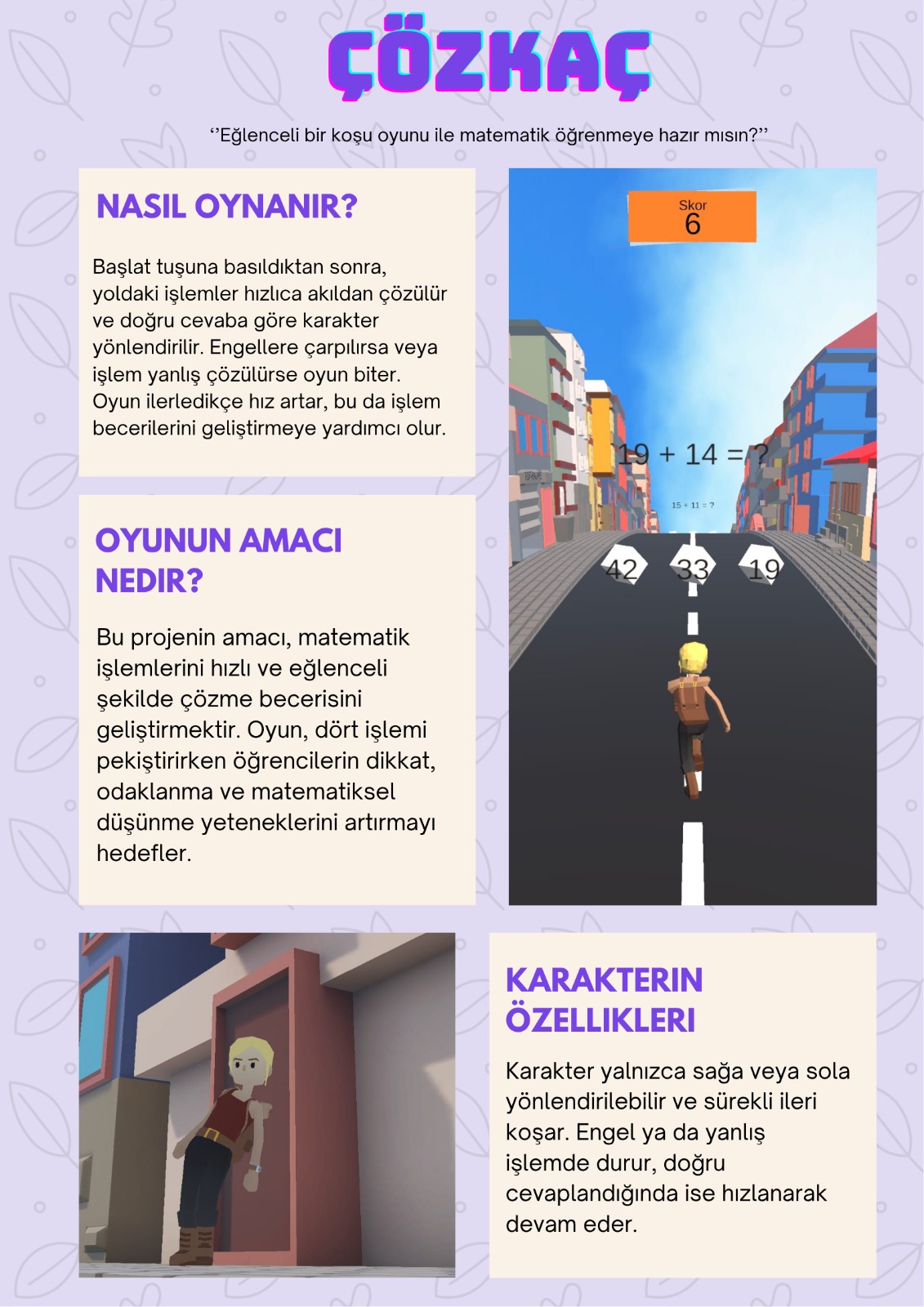 TÜBİTAK 4006 Bilim Fuarı kapsamında gerçekleştirilen bu projede, Unity oyun motoru ve C# programlama dili kullanılarak öğrencilerin matematiksel işlem becerilerini geliştirmeye yönelik bir dijital eğitim oyunu tasarlanmıştır. Projenin amacı, öğrenmeyi eğlenceli hâle getirerek öğrencilerin dikkat, hız ve işlem doğruluğu gibi bilişsel becerilerini desteklemektir. Oyun, Maltepe Fen Lisesinden 8 öğrenci tarafından koşu oyunu mantığı üzerine kurgulanmış; oyuncunun ilerledikçe puan topladığı bir yapı oluşturulmuştur. Belirli aralıklarla oyuncuya matematiksel işlemler sunulmuş ve her işlem için üç şıklı cevap sistemi geliştirilmiştir. Oyuncu, doğru cevabı seçerek karakterin yönünü doğru şekilde belirlemekte, böylece oyuna başarıyla devam etmektedir. Senaryo, işlem türleri ve zorluk seviyeleri öğrencilerle yapılan fikir alışverişleri sonucunda belirlenmiştir. Prototip tamamlandıktan sonra oyun, farklı yaş gruplarından öğrencilerle test edilmiş; bu süreçte doğru cevap sayısı, tepki süresi ve başarı oranları gibi veriler toplanmıştır. Elde edilen bulgular doğrultusunda oyun içeriğinde çeşitli iyileştirmeler yapılmıştır. Bu proje, öğrencilerin hem akademik hem de dijital becerilerini geliştiren, yenilikçi ve katılımcı bir öğrenme modeli sunmaktadır.
