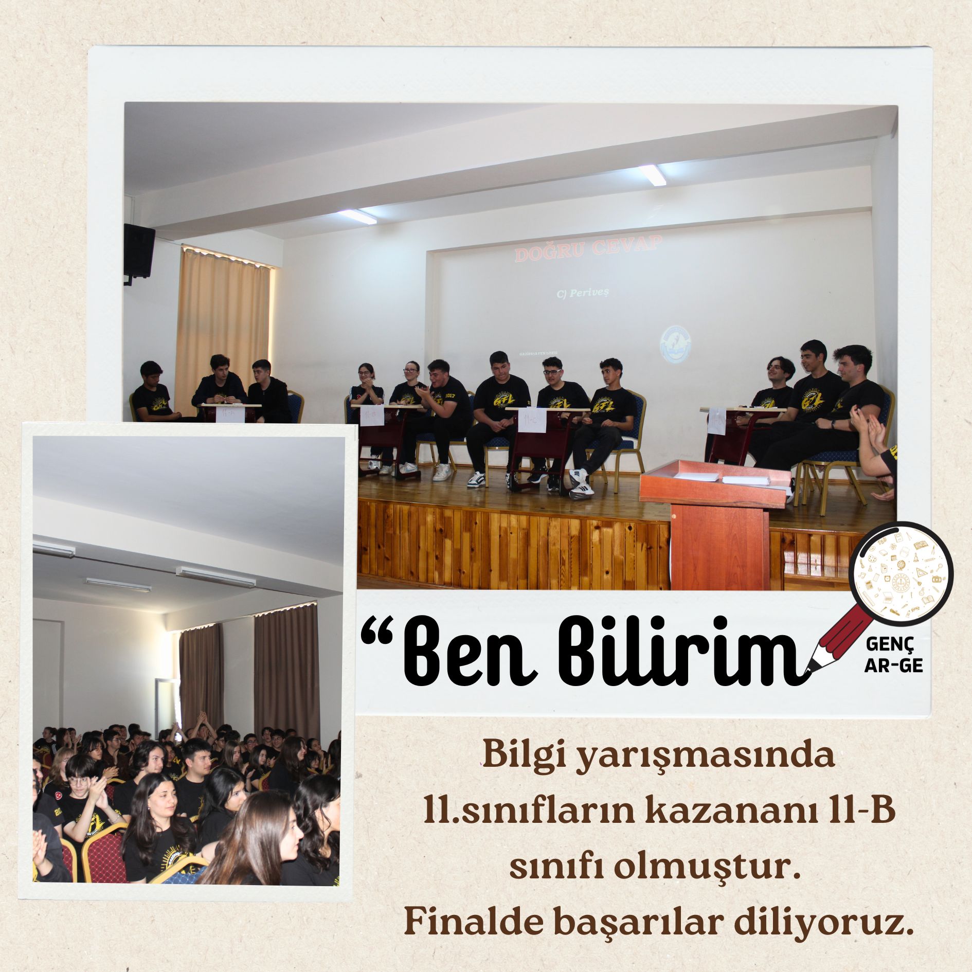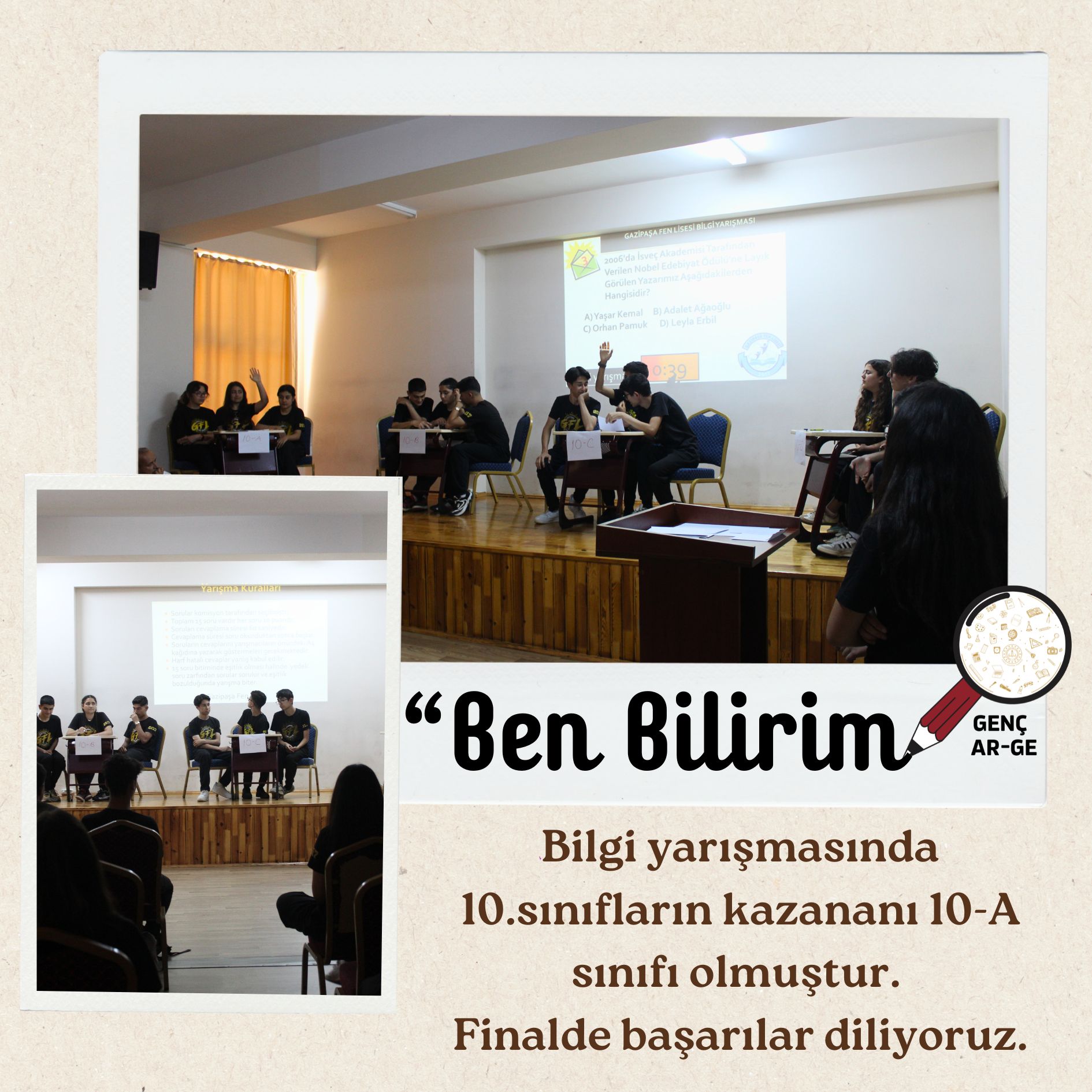 Okulumuzda 1 - 30 Mayıs tarihleri arasında düzenlenen ve dört gün boyunca süren "Ben Bilirim" Sınıflar Arası Genel Bilgi Yarışması, büyük bir heyecan ve kıyasıya rekabetle sona erdi. Öğretmenlerimiz tarafından titizlikle hazırlanan genel kültür ve genel yetenek soruları, her sınıf seviyesinden öğretmen jürilerinin denetiminde yanıtlandı. Yarışmaya toplam 43 yarışmacı, 11 öğretmen ve 202 izleyici katılım sağladı. Takımlar, bilgi birikimlerini sergileyerek izleyenlere unutulmaz anlar yaşattı. Zorlu geçen yarışmaların ardından sınıf şampiyonları şu şekilde belirlendi: 9. Sınıf Şampiyonu: 9/B 10. Sınıf Şampiyonu: 10/A 11. Sınıf Şampiyonu: 11/B Bu başarılı takımların katılımıyla gerçekleşen Büyük Finalde ise, 10/A Sınıfı sergilediği üstün performansla mutlak şampiyon olmayı başardı! Yarışmacılar, bilgileriyle izleyicileri adeta büyülerken, dereceye giren takımlar okul idaremiz tarafından ödüllendirildi. Akademik birikimin keyifle yarıştığı, dostluk ve rekabetin iç içe geçtiği bu anlamlı etkinlikte emeği geçen tüm öğretmenlerimize ve katılan tüm öğrencilerimize teşekkür ederiz.