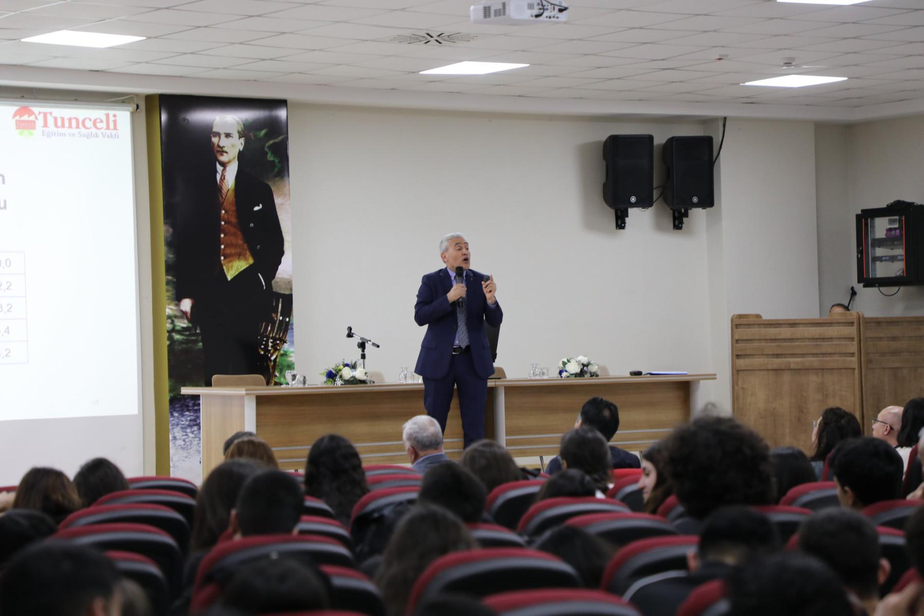 İl Millî Eğitim Müdürlüğümüz ile Tunceli Eğitim ve Sağlık Vakfı iş birliğinde, öğrencilerimizin üniversiteye hazırlık sürecini desteklemek, hedef belirleme, motivasyon ve sınav kaygısıyla başa çıkma gibi konularda etkili rehberlik sağlamak amacıyla önemli bir eğitim programı düzenlendi. Program kapsamında, alanda uzman iki değerli akademisyen Prof. Dr. Ali Ekber Şahin ve Prof. Dr. Osman Tolga Arıcak, Tunceli'deki lise öğrencilerimize yönelik eğitim seminerleri gerçekleştirdi. Öğrencilerimize hem akademik hem de psikolojik açıdan hazırlık sürecini daha verimli yönetebilmeleri için stratejiler sunan seminerler büyük ilgi gördü. Bu anlamlı iş birliğiyle, gençlerimizin akademik hedeflerine bilinçli ve kararlı bir şekilde ilerlemelerine katkı sunmak, Türkiye Yüzyılı vizyonunda güçlü bireyler yetiştirme hedefimize önemli bir adım daha eklemiştir. Etkinliklere toplam 463 kişi katılım sağlamıştır.