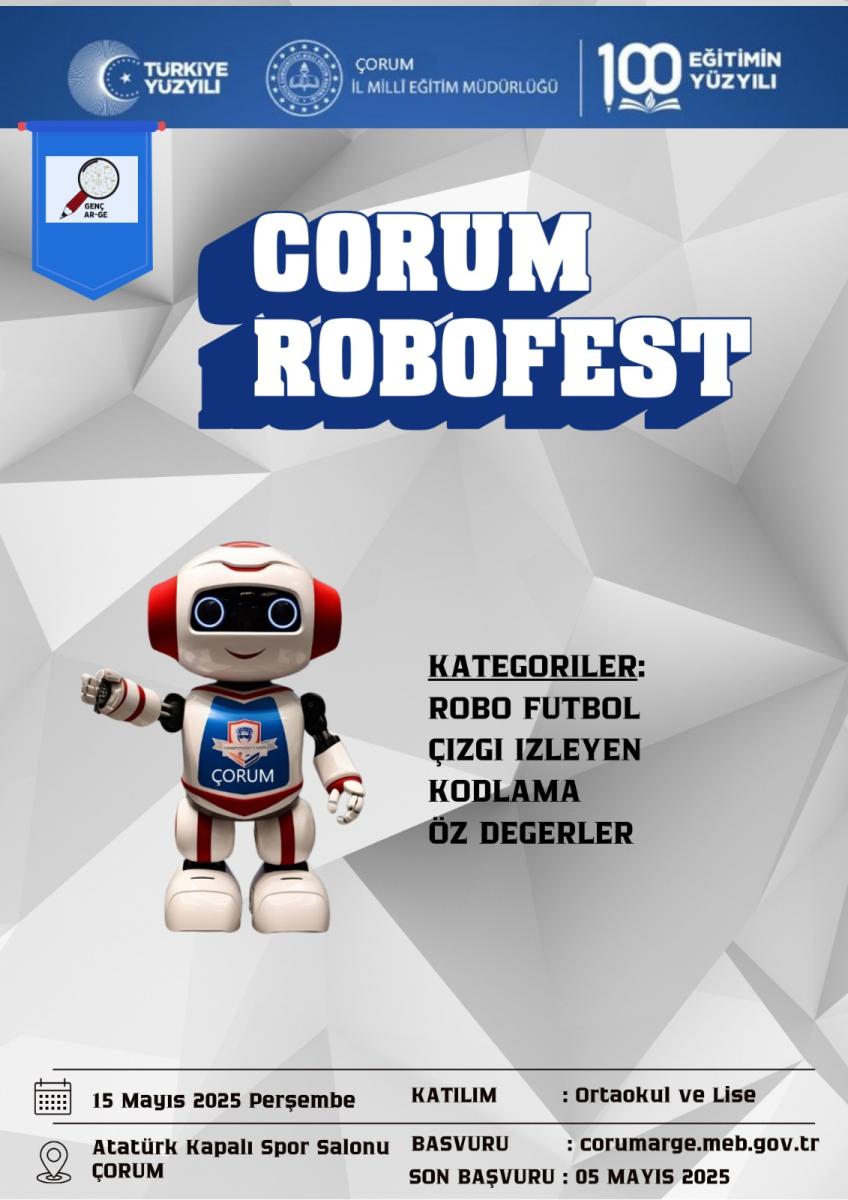Çorum İl Milli Eğitim Müdürlüğü Ar-Ge Birimi Genç Ar-Ge kapsamında , ortaokul ve lise öğrencilerine yönelik "Genç AR-GE Çorum Robofest Robot Yarışması" düzenlenecek. Bu sene ilk olarak düzenlenecek yarışma, 15 Mayıs'ta gerçekleştirilecek. İl genelindeki ortaokul ve liselerde öğrenim gören öğrenciler, danışman öğretmenleriyle birlikte kuracakları takımlarla yarışmaya katılabilecek. Yarışma, 15 Mayıs 2025 Perşembe günü saat 10.00'da Çorum Atatürk Kapalı Spor Salonu'nda yapılacak. Yarışmaya katılmak isteyen takımların başvurularını en geç 5 Mayıs 2025 Pazartesi gününe kadar yapmaları gerekiyor. "Geleceğin Mühendisleri Buraya!" sloganıyla duyurulan yarışma ile ilgili detaylı bilgi ve başvuru işlemleri için birimimizin corumarge.meb.gov.tr adresi ziyaret edilmesi gerekiyor. Yarışma, Çizgi İzleyen, Kodlama, Robofutbol ve Özdeğerler olmak üzere 4 Kategoride yapılacak. Öğrenciler, bu teknoloji şöleninde robotlarıyla yarışacaklar.