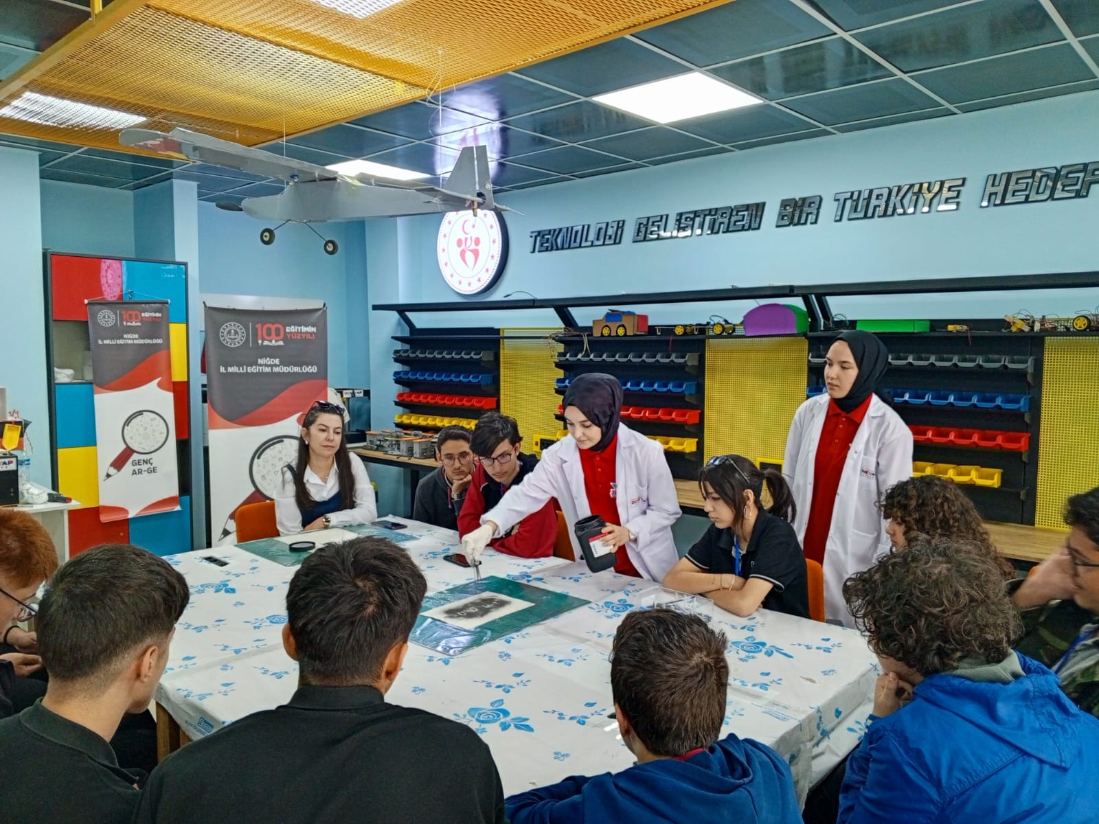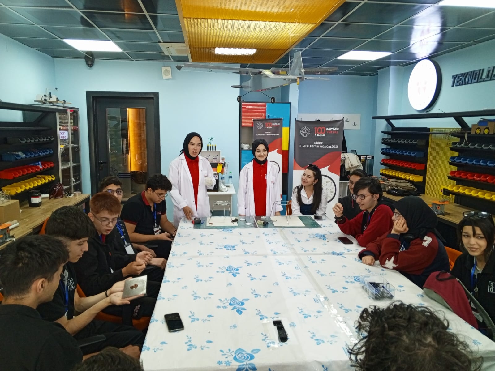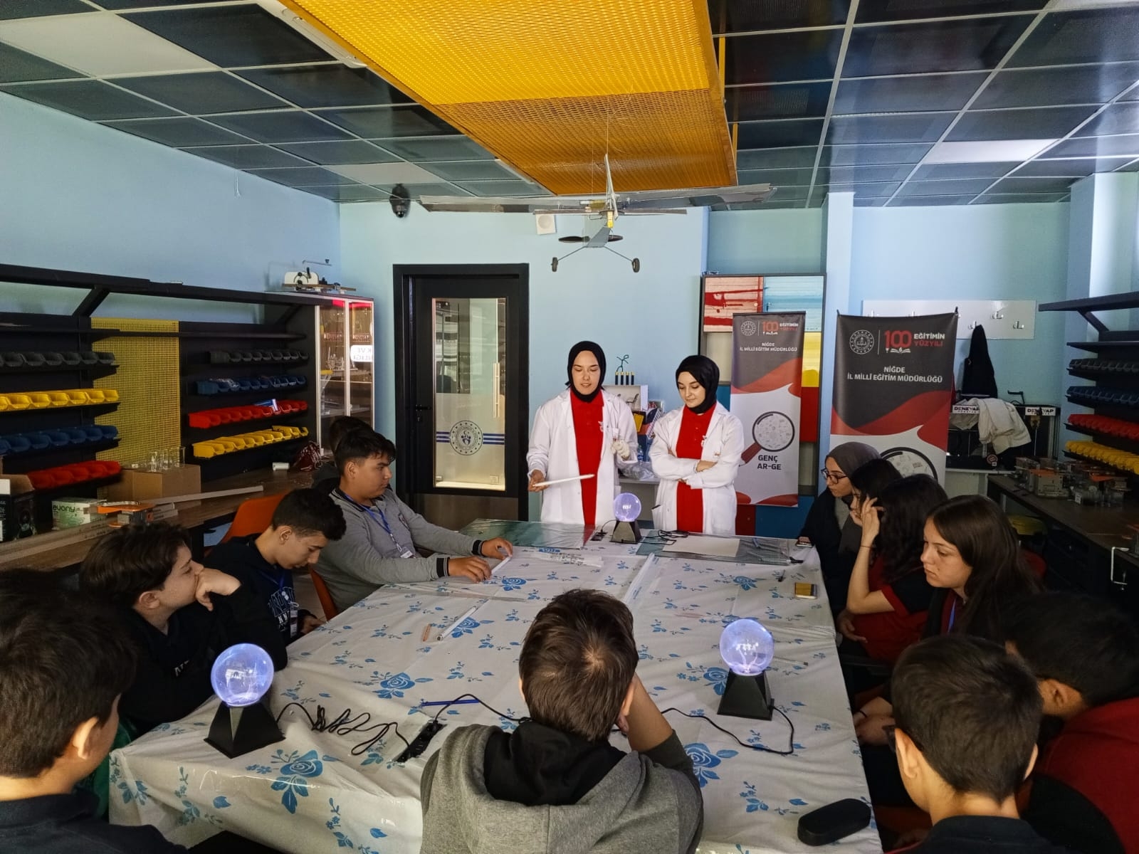 14 Mayıs 2025 tarihinde, saat 09.00–11.00 arasında Niğde Deneyap Atölyesi'nde lise öğrencilerine yönelik “Nanoteknoloji ve Malzeme Bilimi” temalı uygulamalı bir atölye etkinliği gerçekleştirilmiştir. Etkinliğe Niğde Şehit Ramazan Konuş Gençlik ve Spor Merkezi ile Deneyap iş birliğiyle toplam 45 lise öğrencisi katılmıştır. Çalışmalar, Deneyap sorumlusu Büşra Nur Yıldırım koordinasyonunda; Niğde Ömer Halisdemir Üniversitesi Elektrik-Elektronik Mühendisliği 3. sınıf öğrencileri Elif Bekteş ve Melek Elmas tarafından yürütülmüştür. Etkinlikte; nişasta kullanılarak viskozite deneyi yapılmış, non-newton akışkan özellikleri uygulamalı olarak incelenmiştir. Özgül ısı deneyinde su, alkol ve sıvı yağın sıcaklık değişimleri belirli aralıklarla ölçülmüş; maddelerin ısıyı tutma kapasiteleri karşılaştırılmıştır. Aerojel maddesiyle yapılan ısı yalıtım deneyinde, çikolatanın metal ve aerojel yüzeylerdeki tepkileri gözlemlenmiştir. Mıknatıs-kağıt-demir tozu deneyinde manyetik alan çizgileri görselleştirilmiş; Tesla plazma küresiyle floresan lambaya kablosuz enerji aktarımı sağlanmıştır. Hedef kitle olan lise öğrencileri, temel fizik, malzeme bilimi ve mühendislik uygulamalarıyla tanışarak deneysel gözlem, yorumlama ve problem çözme becerilerini geliştirmiştir. Etkinlik sonunda yapılan değerlendirmelere göre katılımcıların %90’i deneylerin ilgilerini artırdığını belirtmiştir. Bilime ve mühendisliğe yönelik farkındalık oluşturulmuş, atölye ortamında öğrenmeye karşı olumlu tutum gelişmiştir.