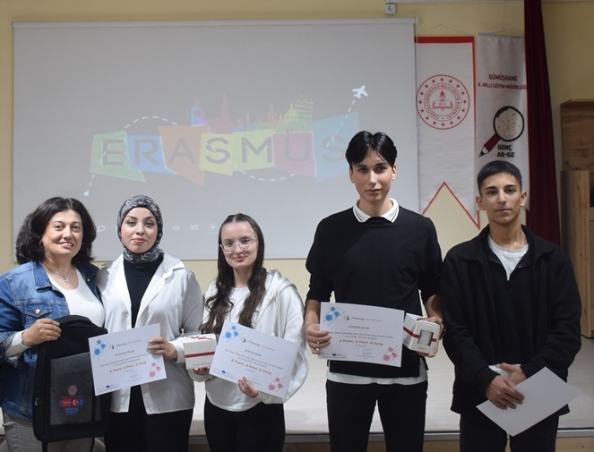 Gümüşhane İl Millî Eğitim Müdürlüğü Akreditasyon Projesi kapsamında Erasmus Hareketliliklerine katılan öğrencilerimiz Mareşal Çakmak Sosyal Bilimler Lisemizin ev sahipliğinde deneyimlerini öğrencilerimizle paylaştı. Etkinliğin ana gündem maddesi, 16-22 Mart 2025 tarihleri arasında Belçika'nın Gent şehrinde gerçekleştirilen kısa dönem öğrenci hareketliliğine katılan 12 öğrencimizin deneyimleri olurken; öğrenciler, hareketlilik süresince edindikleri kültürel, akademik ve kişisel kazanımları, hazırladıkları sunumlar ile arkadaşlarıyla paylaştılar. Belçika'daki eğitim ortamını, farklı kültürlerle etkileşimi ve uluslararası bir projede çalışmanın getirdiği heyecanı dinleyicilere aktardılar. Deneyim paylaşımının ardından, hareketliliğe katılan 12 öğrencimize, uluslararası tecrübelerini belgeleyen katılım sertifikaları törenle takdim edildi. Yapılan paylaşım toplantısına ise 6 öğretmen ve 70 öğrenci katıldı.