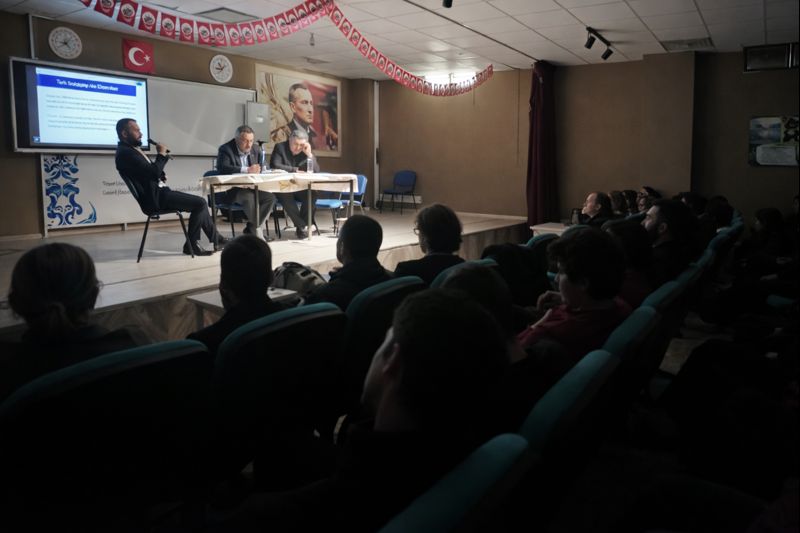 Nevit Kodallı Güzel Sanatlar Lisesinde, Mersin Üniversitesi öğretim üyelerinden Prof. Dr. H. Akdağ, Öğr. Gör. G. Temiz ve Doç. Dr. İ. Öztürk’ün katkılarıyla “Türk Mitolojisi ve Destanlar” başlıklı panel gerçekleştirildi. Resim Bölümü öğrencilerimize yönelik olarak düzenlenen panelde; Türk mitolojisinin köklü ve zengin dünyası, destanların kültürel belleğimizdeki yeri ile bu anlatıların sanatla kurduğu güçlü bağ ele alındı. Mitolojik unsurların görsel sanatlara yansımaları, semboller ve anlatı dili üzerinden örneklerle değerlendirildi. Öğrencilerimizin kültürel farkındalıklarını artırmalarına, sanatsal üretim süreçlerine yeni bakış açıları kazandırmalarına ve geleneksel anlatıları çağdaş sanatla ilişkilendirmelerine katkı sunan bu değerli etkinlik, yoğun ilgiyle takip edildi.